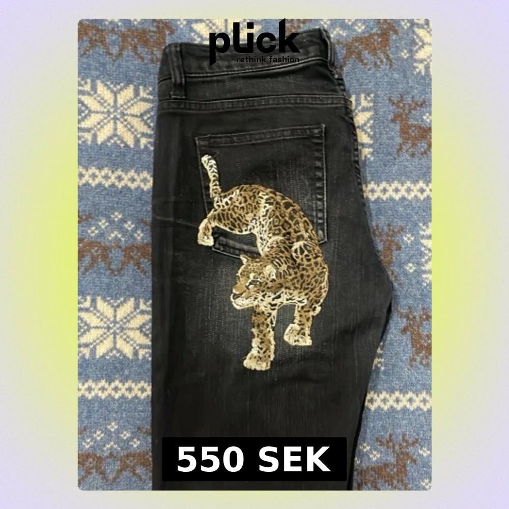 Unika svarta jeans från Acne Jeans med coolt leopardbroderi på bakfickan. Jeansen har en straight passform, klassiska fem fickor och snygga slitningar framtill. Materialet är jeans och färgen är mörk med ljusa detaljer. Perfekt för dig som vill sticka ut med din stil.