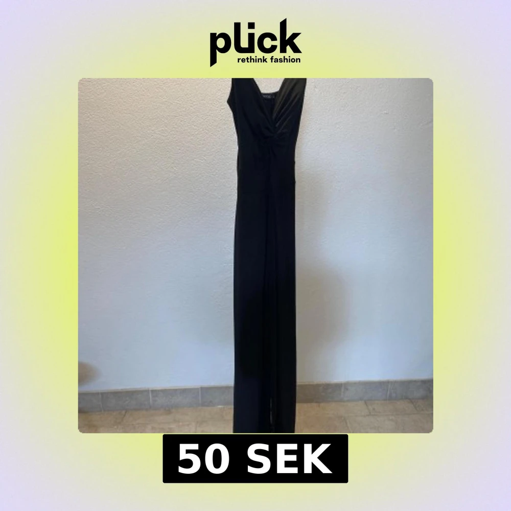 Säljer en svart byxdress från Boohoo med breda ben och twistad detalj framtill. Byxdressen har smala axelband och är tillverkad i ett mjukt, stretchigt material som faller snyggt. Perfekt för dig som gillar stilrena och bekväma plagg.