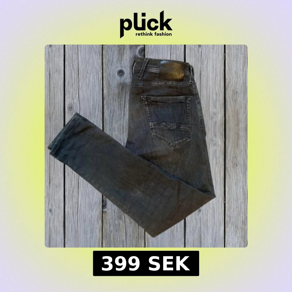 Snygga & stilrena svart & grå jeans från Replay i slim fit modell Anbass. Ett par eftertraktade jeans som är väldigt trendiga inom grisch-stilen. Jeansen har en dragkedjedetalj vid fickan och en mörk tvätt som ger en cool look. Märkespatch i svart läder baktill. Slim passform | Storlek: 32/32 | Skick: 8/10 | Tveka inte att höra av er vid minsta fundering! 😊