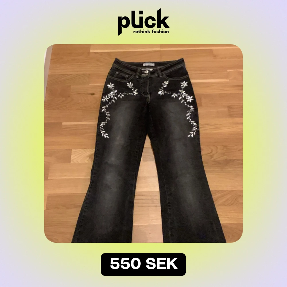 Snygga och unika byxor med pärlor på!! De är utsvängda och har passformen av midwaist🩷 De passar mig bra som är 163 cm!