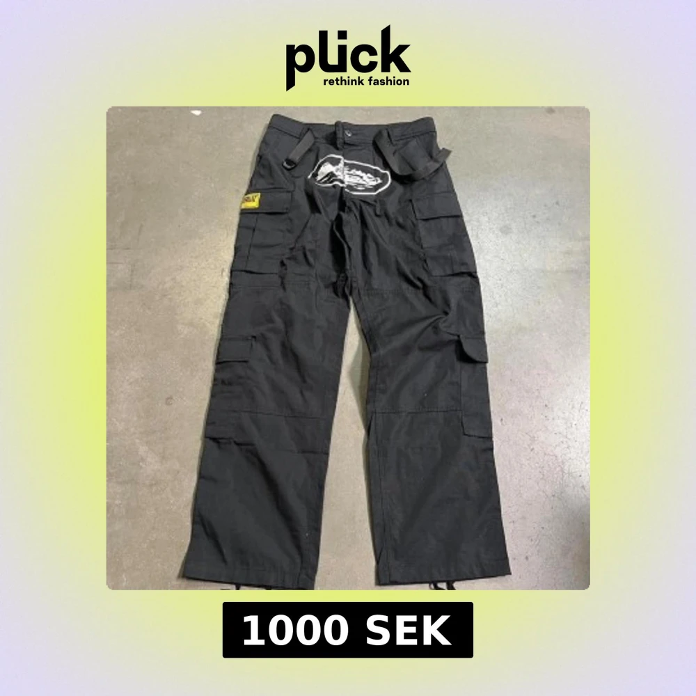 Gråa cargopants med flera fickor, patch med gul text på vänster ben och corteiz logan ovanför gylfen. Byxorna har bred passform och justerbara band i midjan. Perfekta för dig som gillar streetwear. Ej använd och priset kan förhandlas då jag vill sälja snabbt