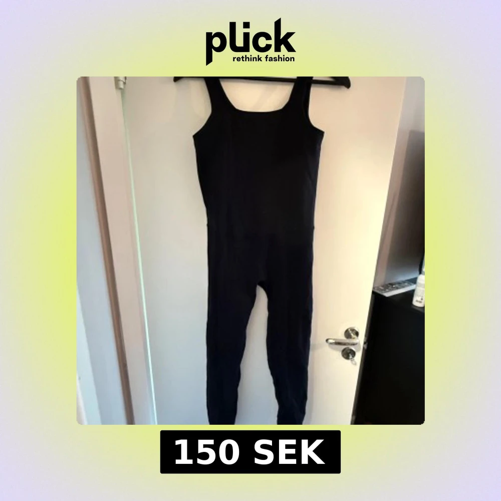 Säljer en svart, tight jumpsuit med smala axelband och långa ben. Perfekt för träning eller som basplagg. Materialet är stretchigt och följsamt för en bekväm passform.