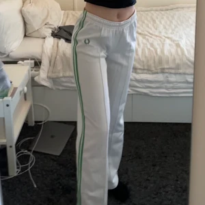 Skitsnygga vita/gröna Fred Perry byxor i strl 38. Byxorna passar även mig som har strl 34 eftersom det finns en knytning på insidan vid midjan som man kan dra åt. Låg midja. Säljer för att de aldrig kommit till användning. Hör av dig om du har några frågor kring plagget eller om du vill se fler bilder💕💕