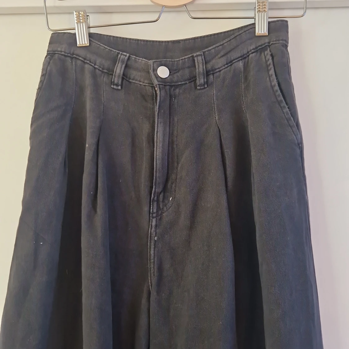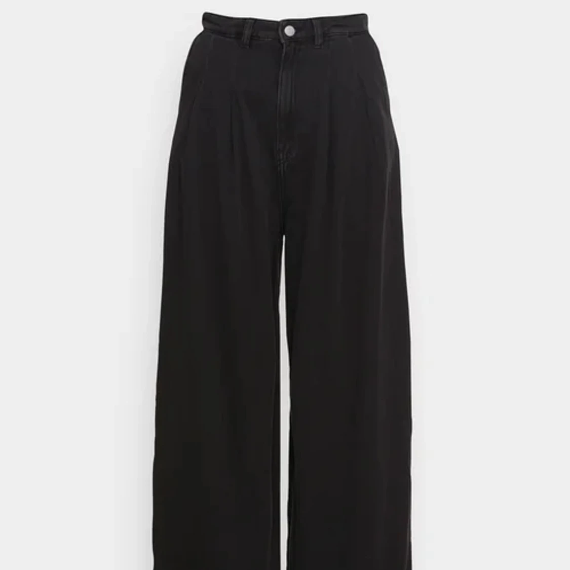 Svarta plisserade jeansbyxor med vida ben. Brand: Monki Size: 36