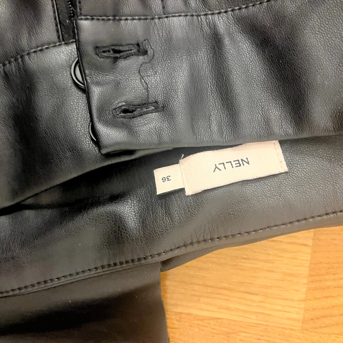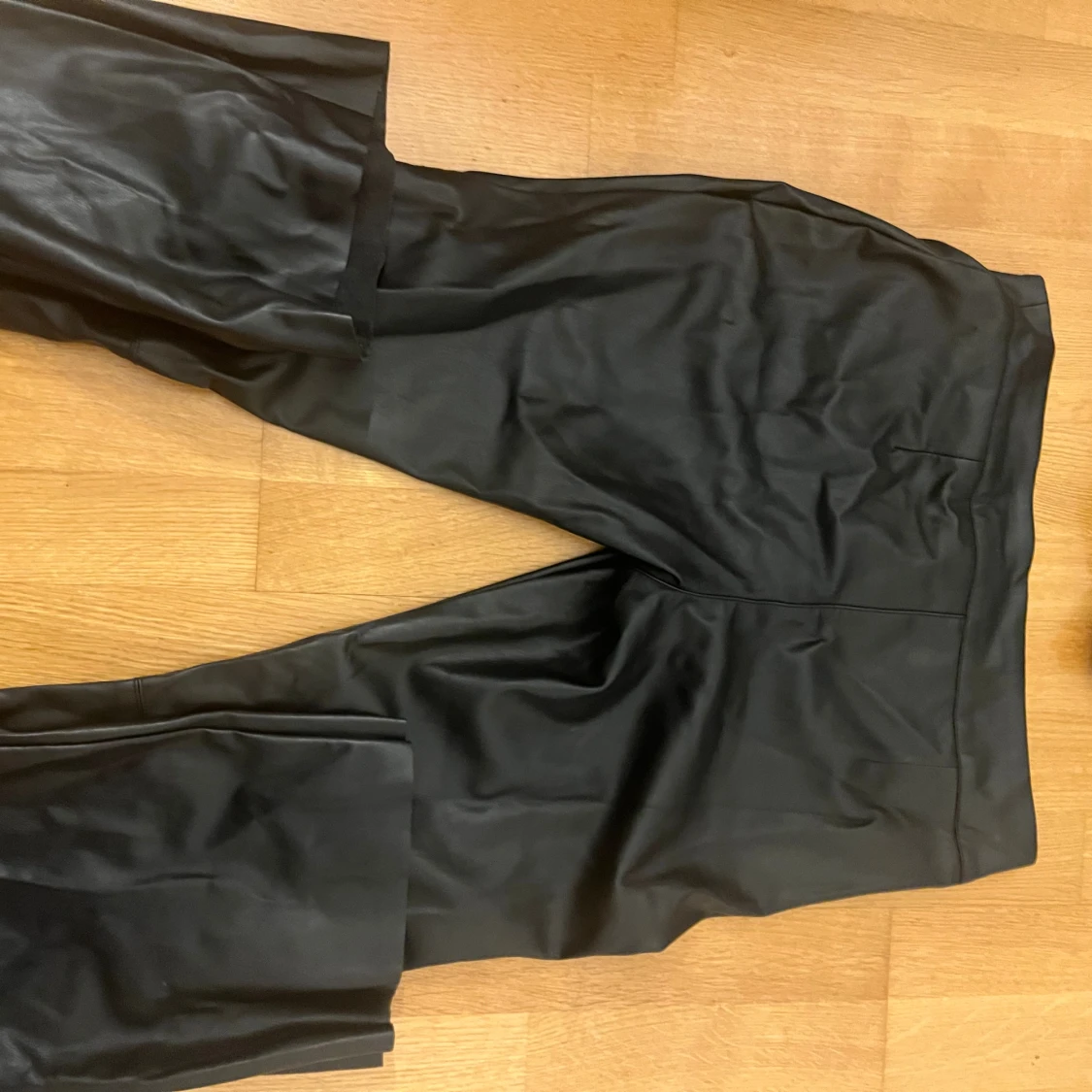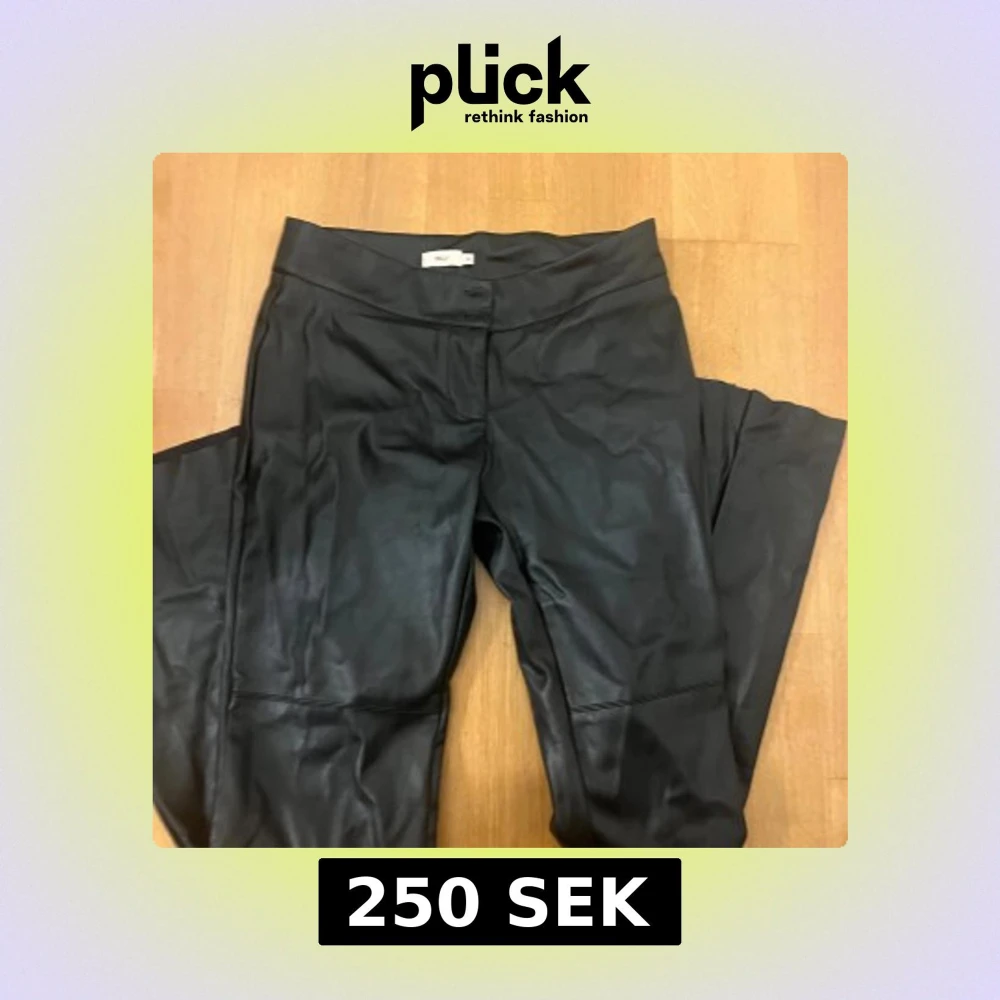 Svart skinnbyxor från Nelly. Byxorna är utsvängda och low waist. Kommer aldrig till användning.