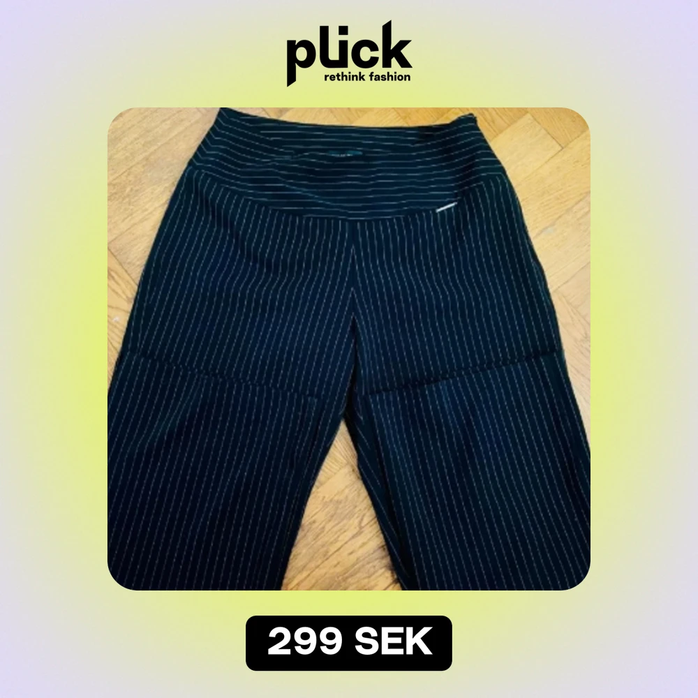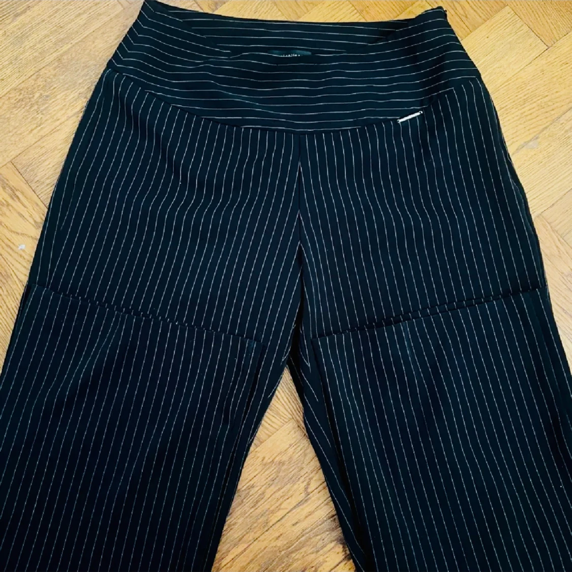 Säljer ett par svarta byxor med vita ränder. Byxorna har en hög midja och en rak passform med dragkedja på sidan. Perfekta för vardag