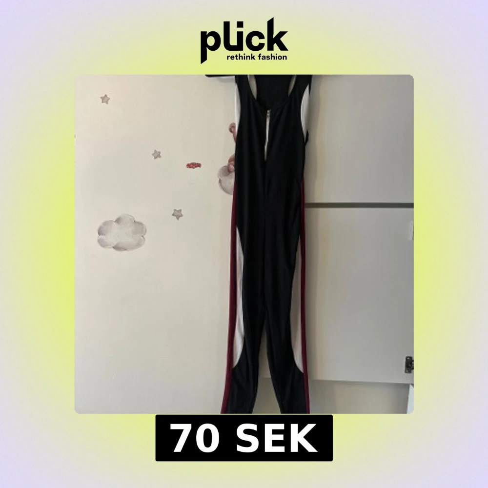 Sportig jumpsuit i svart med vita och vinröda paneler längs sidorna. Modellen är ärmlös med djupa ärmhål och har en dragkedja framtill. Perfekt för träning eller danspass. Materialet är stretchigt och följsamt för maximal rörelsefrihet.