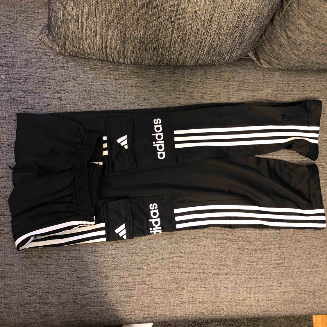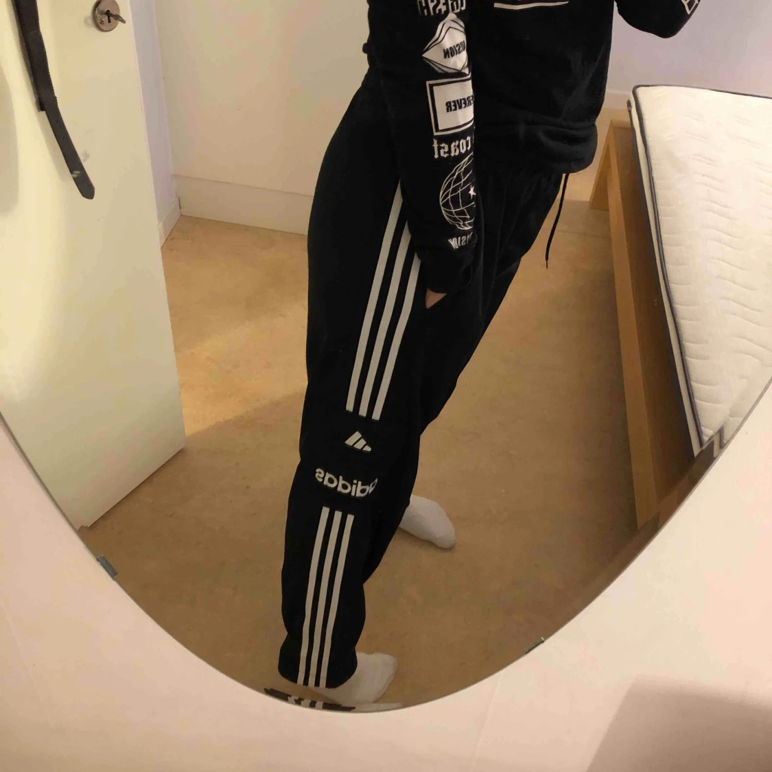 Adidas byxor. De är raka och i egentligen herr storlek. Passar mig som har 38 i damstorlek, för den som gillar lite mer lösa byxor. Väldigt sköna men använder inte längre tyvärr.