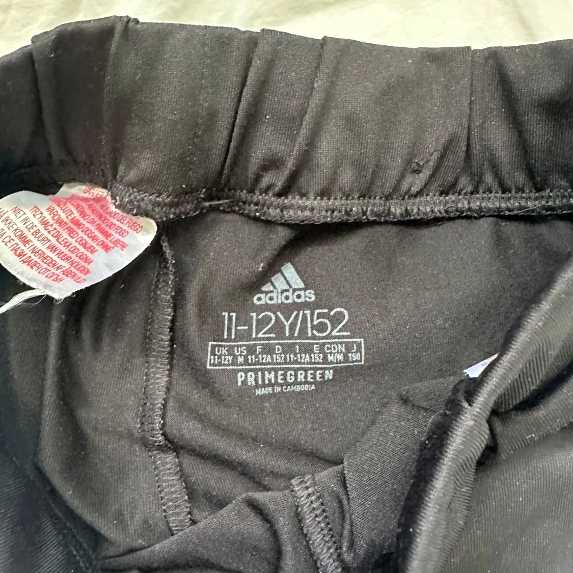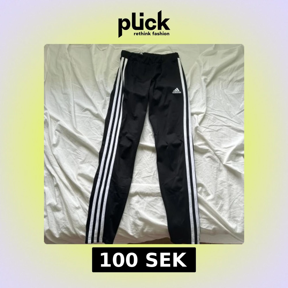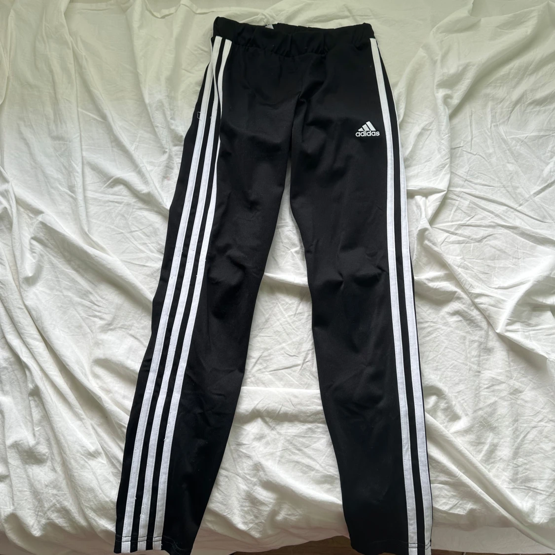 Svarta Adidas byxor med klassiska tre vita ränder längs sidorna och Adidas-logga på låret. Byxorna har resår i midjan och är tillverkade i ett mjukt och stretchigt material, perfekt för träning eller chill. Primegreen-material.