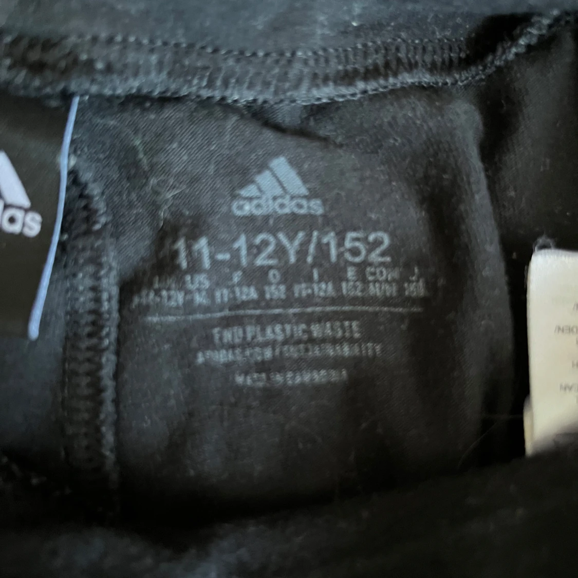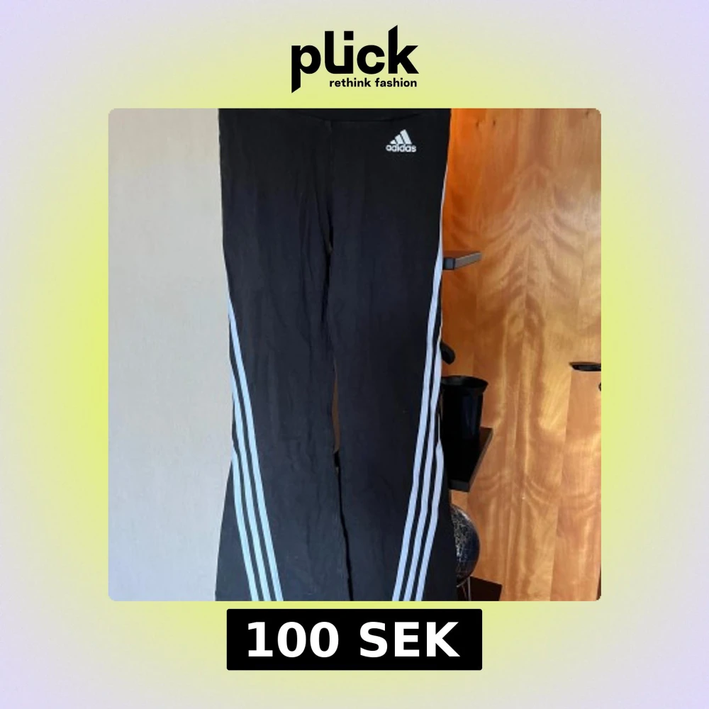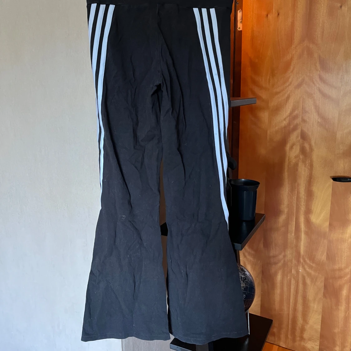 Svarta Adidas byxor med klassiska vita ränder längs benen och Adidas-logga framtill. Byxorna har bootcut-modell med utsvängda ben och är tillverkade i mjukt material som passar perfekt till träning eller chill. Elastisk midja för skön passform. Ca 60 cm midjemått och 91 cm topp till tå.