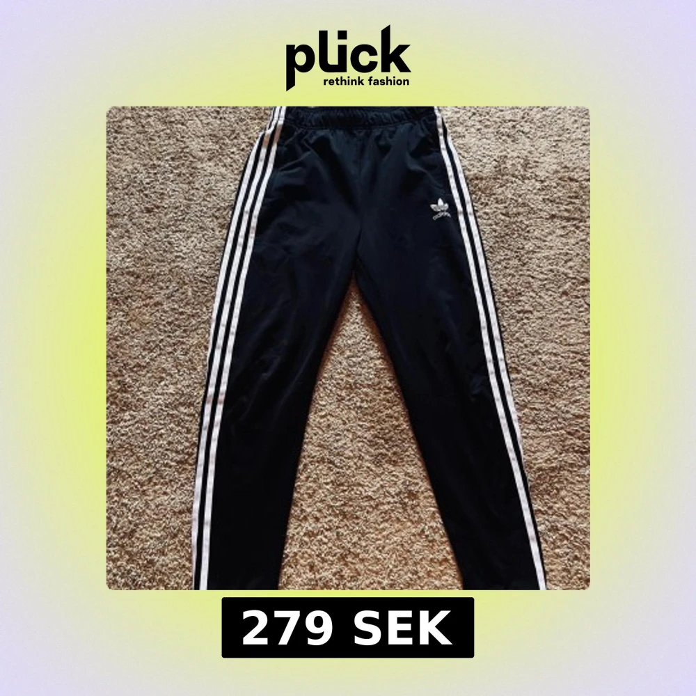 Svarta Adidas byxor med klassiska vita ränder längs sidorna och broderad logga på låret. Byxorna har resår i midjan och är gjorda i ett mjukt, syntetiskt material. Perfekta för chill eller träning. Nypris 499kr!