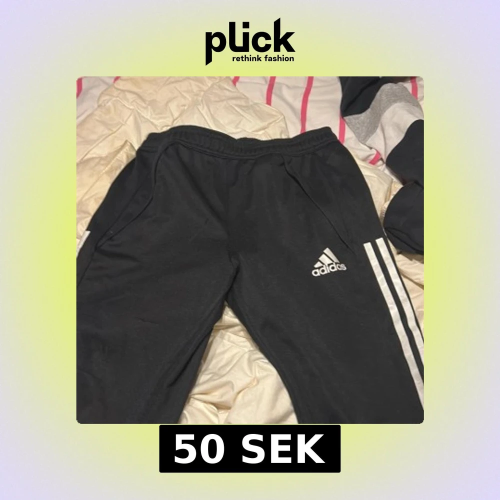 Svarta mjukisbyxor från Adidas med klassiska vita ränder längs sidorna och Adidas-logga på benet. Byxorna har elastisk midja och är gjorda i mjukt polyester-material, perfekta för chill eller träning. Snygg och sportig look som funkar till hoodie eller t-shirt.