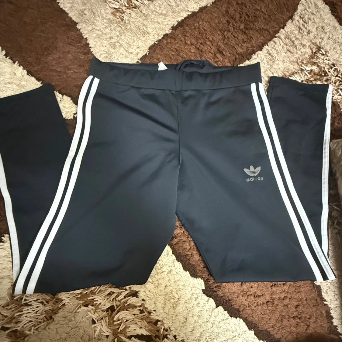 Svarta mjukisbyxor från Adidas med klassiska vita ränder längs sidorna och Adidas-logga på låret. Byxorna har elastisk midja och är tillverkade i ett mjukt, syntetiskt material som passar perfekt för träning eller chill. Snygg och sportig look. Helt nya