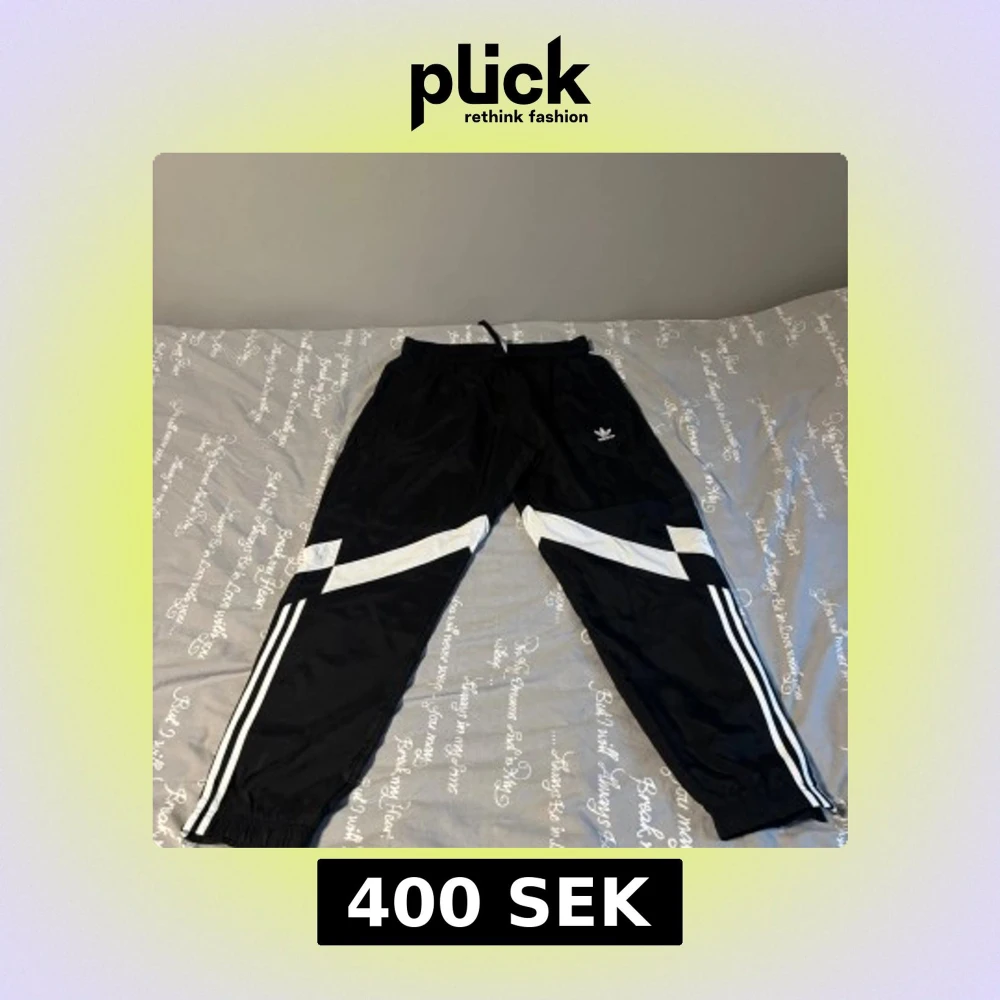 Svarta täckbyxor från Adidas med vita ränder längs benen och vita geometriska detaljer på sidorna. Byxorna har elastisk midja med snörning och Adidas-logga på vänster lår. Perfekta för sportiga dagar och chill stunder.