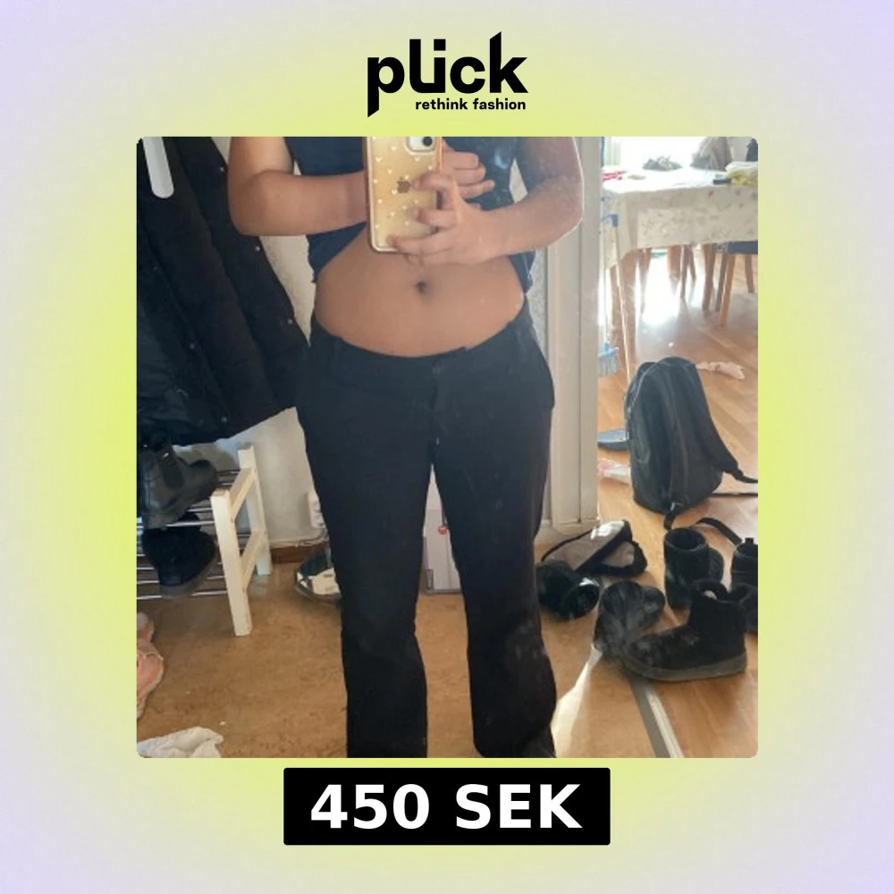 Snygga svarta bootcut kostymbyxor med låg midja. Perfekta för en stilren look. Byxorna har en klassisk design med en lätt utsvängd passform som ger en modern touch.
