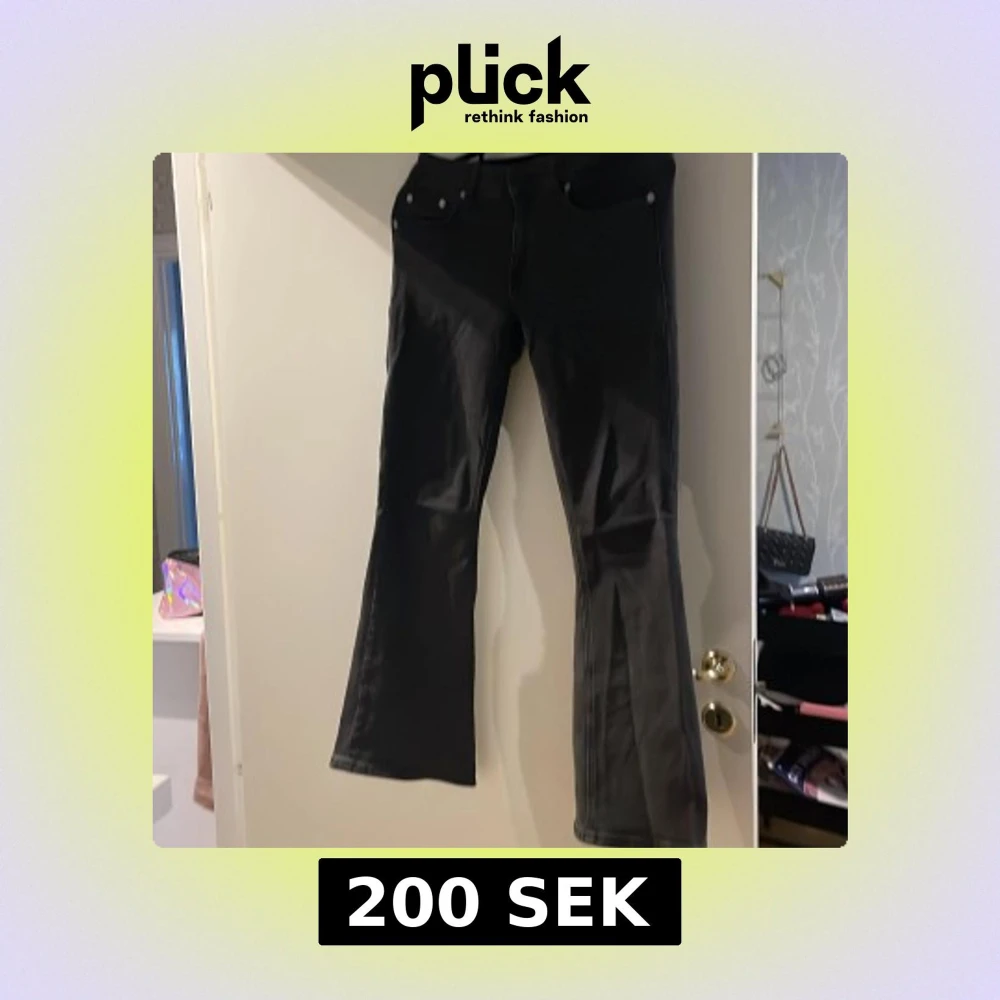 Snygga svarta bootcut byxor från 157 i storlek S med kort längd. Klassisk femficksmodell med dragkedja och knapp framtill. Byxorna har en rak passform upptill och utsvängda ben, vilket ger en cool siluett. Perfekta för dig som gillar stilrena och trendiga byxor.