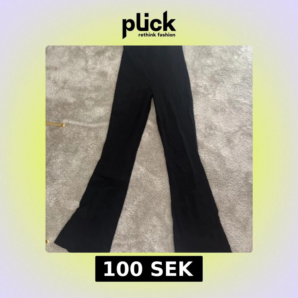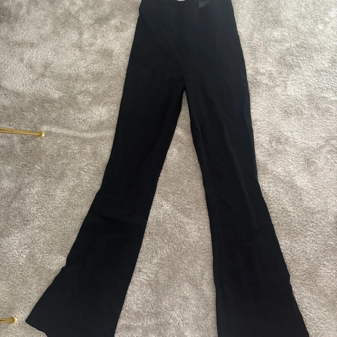 Svarta bootcut byxor från H&M i storlek XS. Byxorna är yoga byxor och i ett stretchigt material som sitter snyggt och bekvämt. Perfekta för dig som gillar en klassisk och stilren look med lite utsvängda ben.