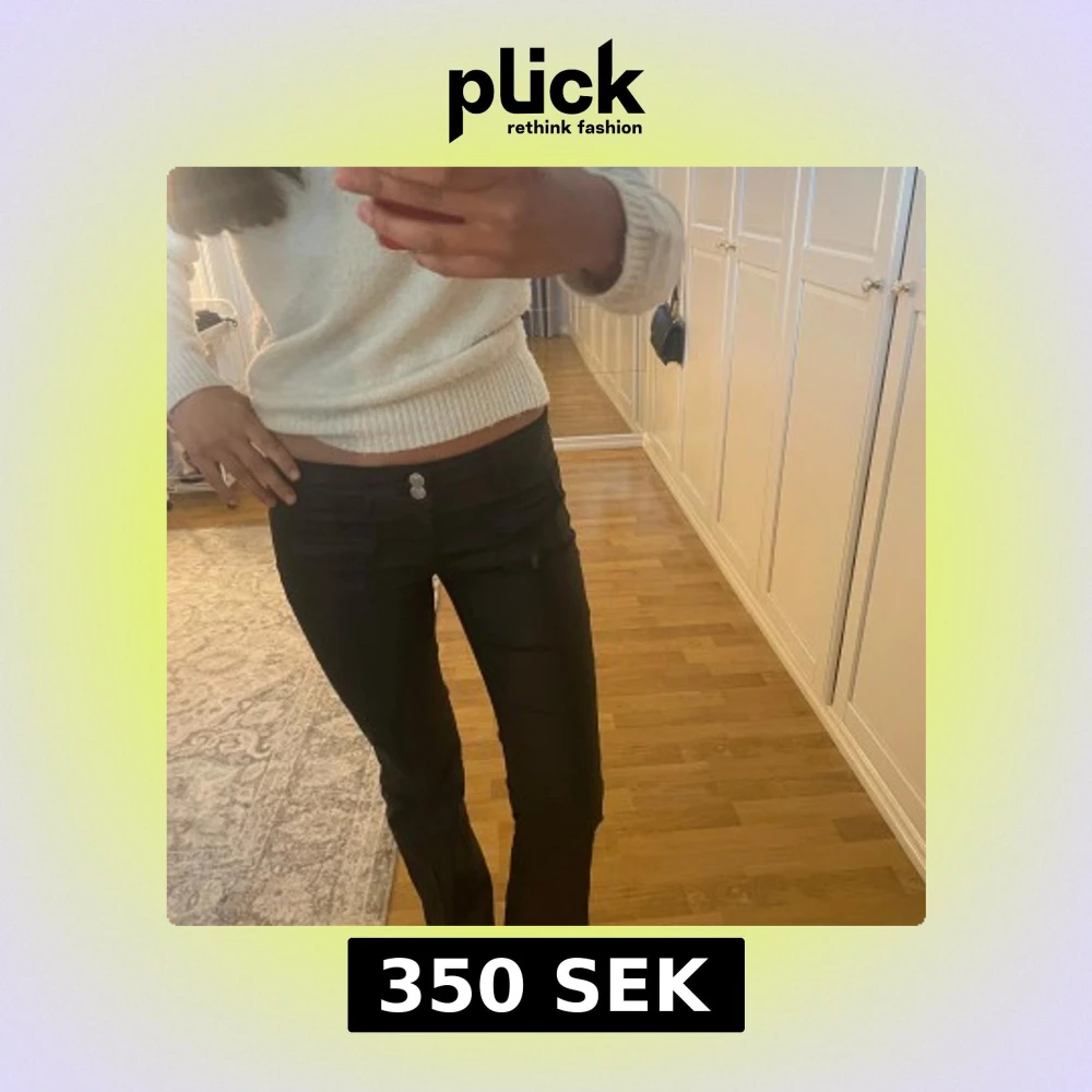 Säljer ett par svarta bootcut skinnbyxor byxor från Nelly i storlek 36. Byxorna har låg midja, två knappar framtill och 2 snygga framfickor dem är klippta för den var för långa men dem passar mig i längden bra som är 164 dem är helt slutsålda på Nelly klöppta för 700