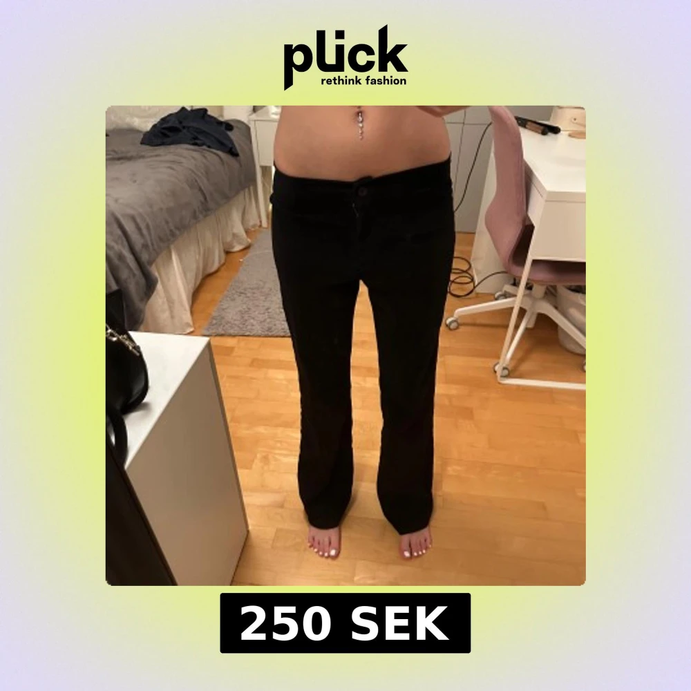 Säljer ett par svarta bootcut byxor från Åhléns i mjukt och lent tyg. De har låg midja och klassisk knappstängning framtill. Passformen är normal och materialet känns skönt mot huden. Perfekta om du gillar en stilren look med lite utsvängda ben.