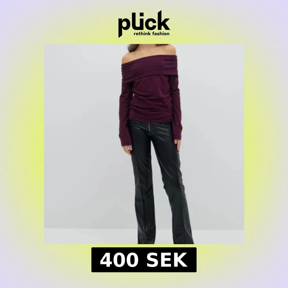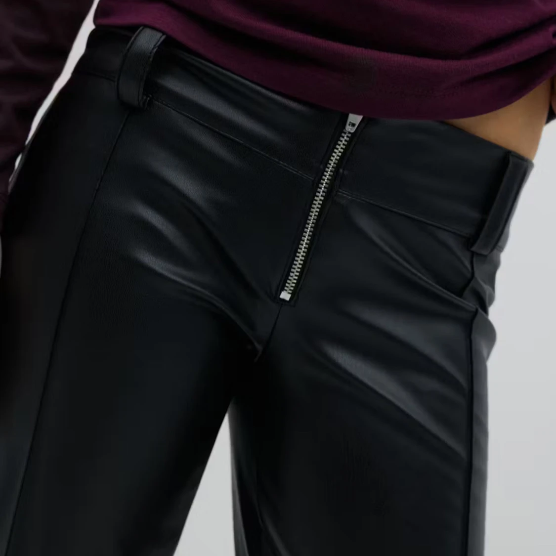 Snygga svarta byxor i skinnimitation med bootcut-snitt och markerad dragkedja framtill. Byxorna har midwaist och sitter bra. Slutsålda på hemsida och i butik!🩷kom med prisförslag!!