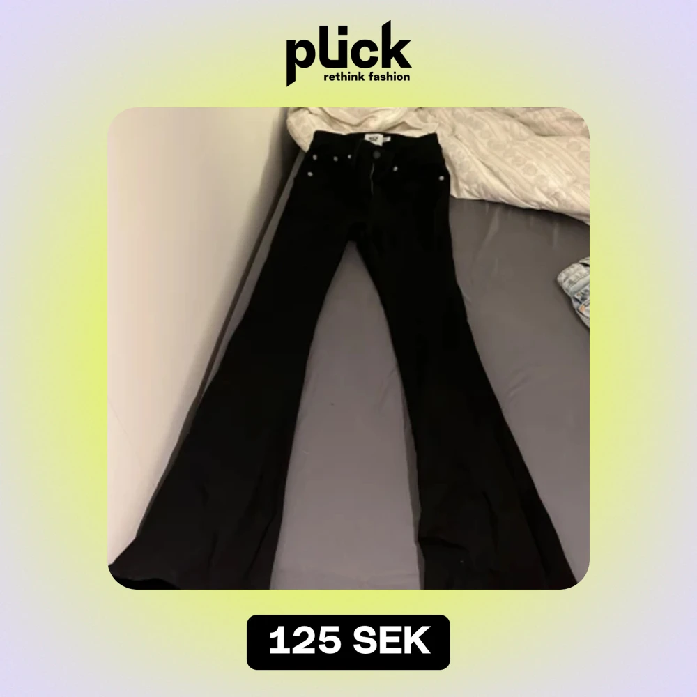 Säljer ett par svarta bootcut byxor i bra skick. De är högmidjade och har en klassisk stil som passar perfekt till både vardag och fest. Byxorna är gjorda i ett mjukt och bekvämt material som ger en snygg siluett.