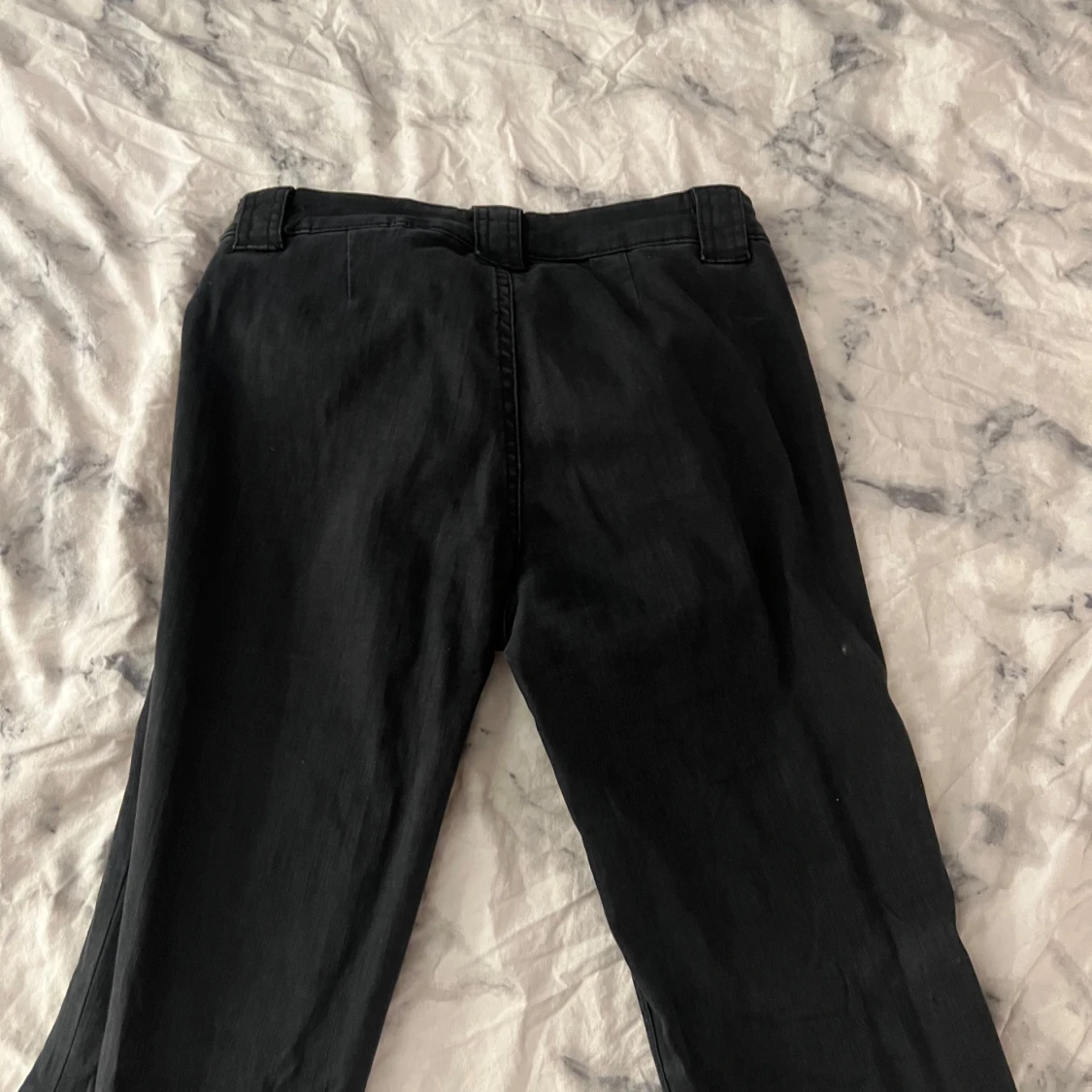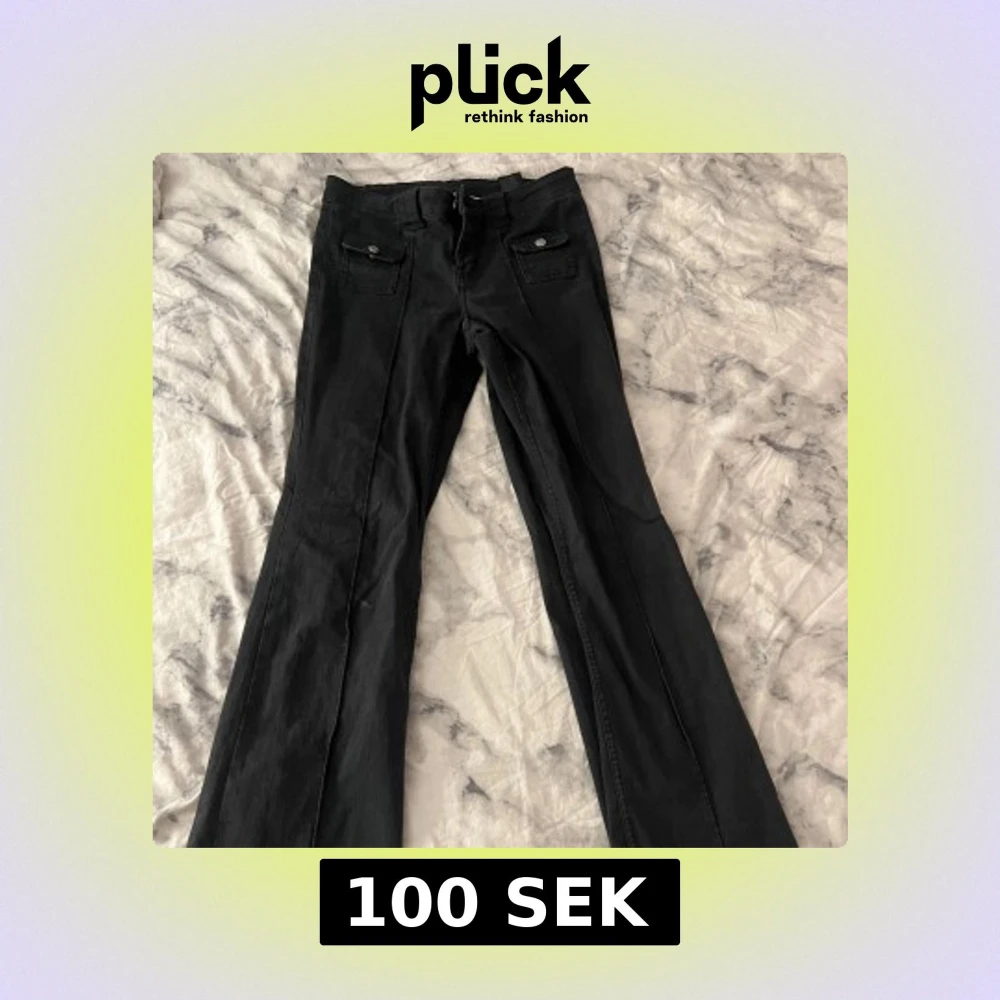 Snygga svarta byxor med bootcut passform och raka ben. Framtill finns två fickor med lock och knappdetalj. Inga bakfickor