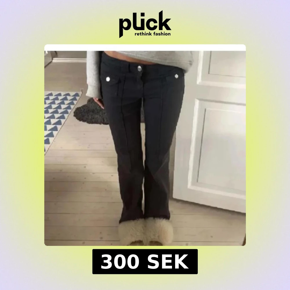 Snygga svarta byxor med bootcut-modell och markerade pressveck framtill. Byxorna har framfickor med dekorativa knappar och låg midja. Perfekta för en trendig och avslappnad look.