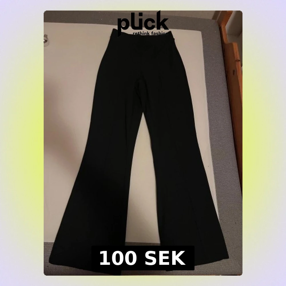 Snygga svarta bootcut byxor med hög midja och raka ben. Materialet är mjukt och har lite stretch, vilket gör dem bekväma att bära. Perfekta för dig som gillar en stilren och trendig look med markerad siluett.