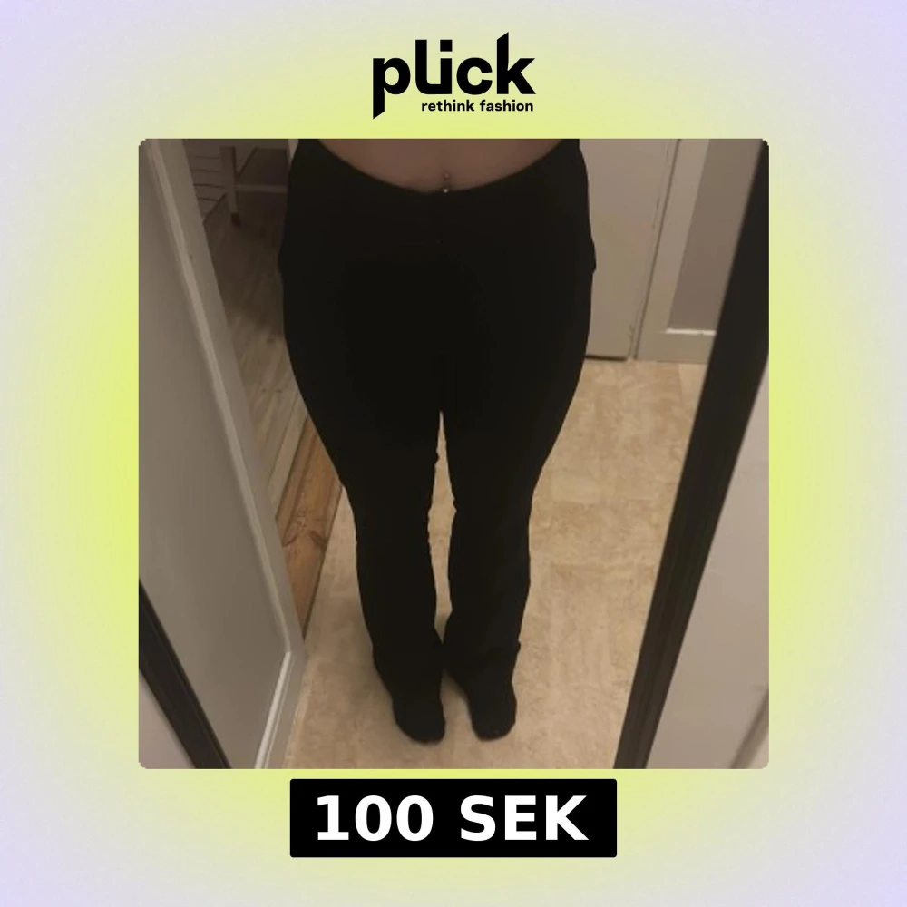 Säljer ett par svarta byxor med bootcut-snitt och hög midja. Byxorna har en klassisk, stilren look och sitter snyggt över höften. Passar dig som gillar en tidlös och clean stil. Materialet känns mjukt och följsamt mot kroppen.