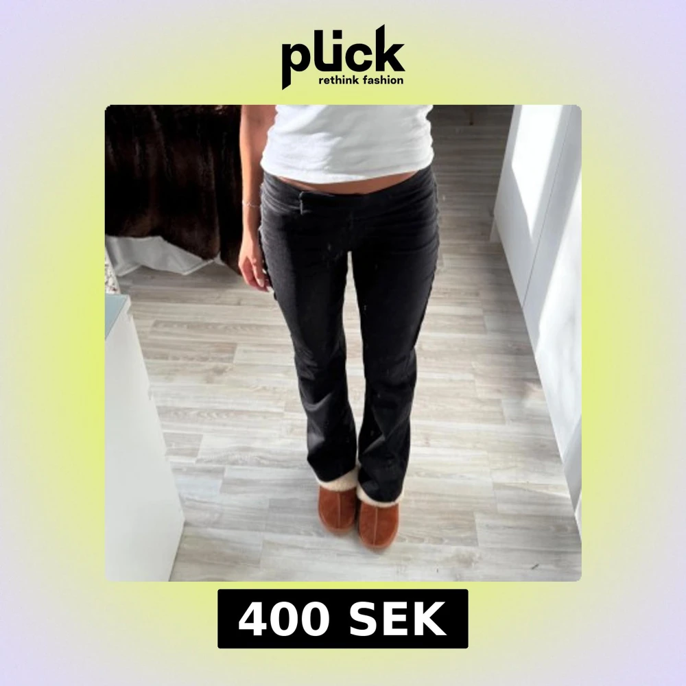 Snygga svarta byxor med bootcut-snitt och låg midja. Från Åhléns i storlek 36. Saknar en knapp i midjan som fungerar som ett extra spänne. Den har två andra spännen i midjebandet så detta påverkar ej så mycket!