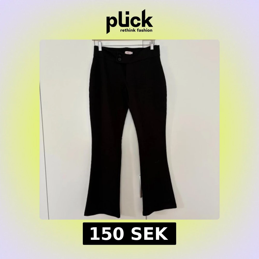 Säljer ett par svarta byxor med bootcut-modell och låg midja. Byxorna har två knappar framtill och är i ett stretchigt material som sitter snyggt över höfterna. Perfekta till både vardag och när du vill känna dig extra snygg.