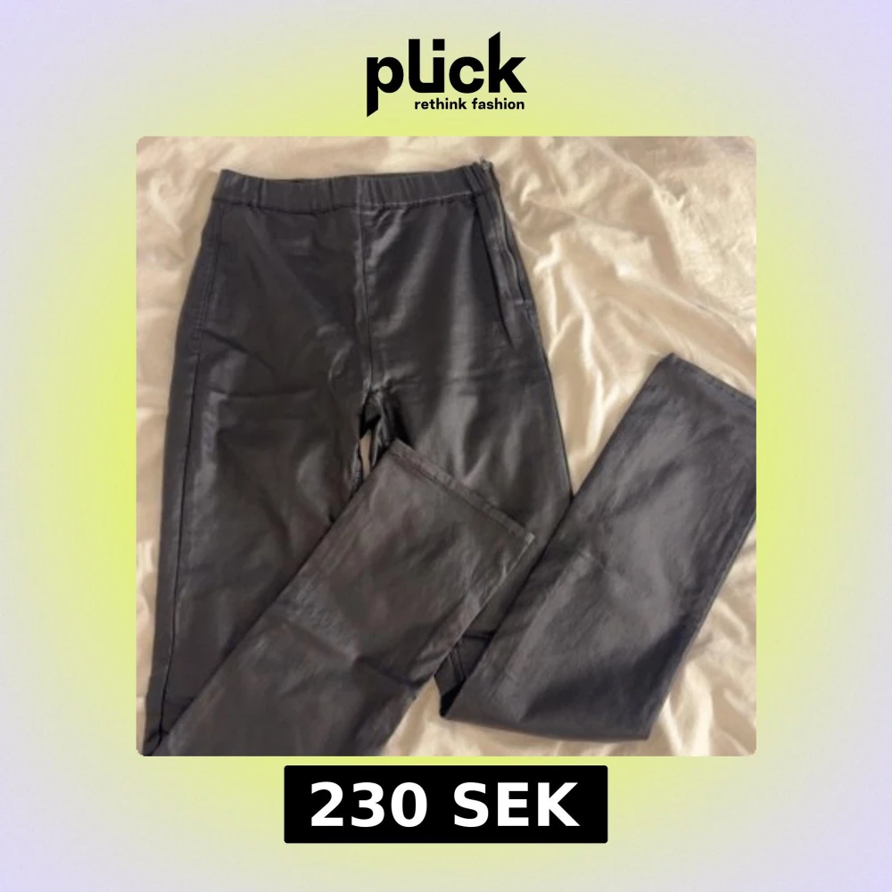 Säljer ett par svarta, högmidjade byxor i skinnimitation med bootcut passform och slits. Byxorna har dragkedja i sidan och bakfickor.