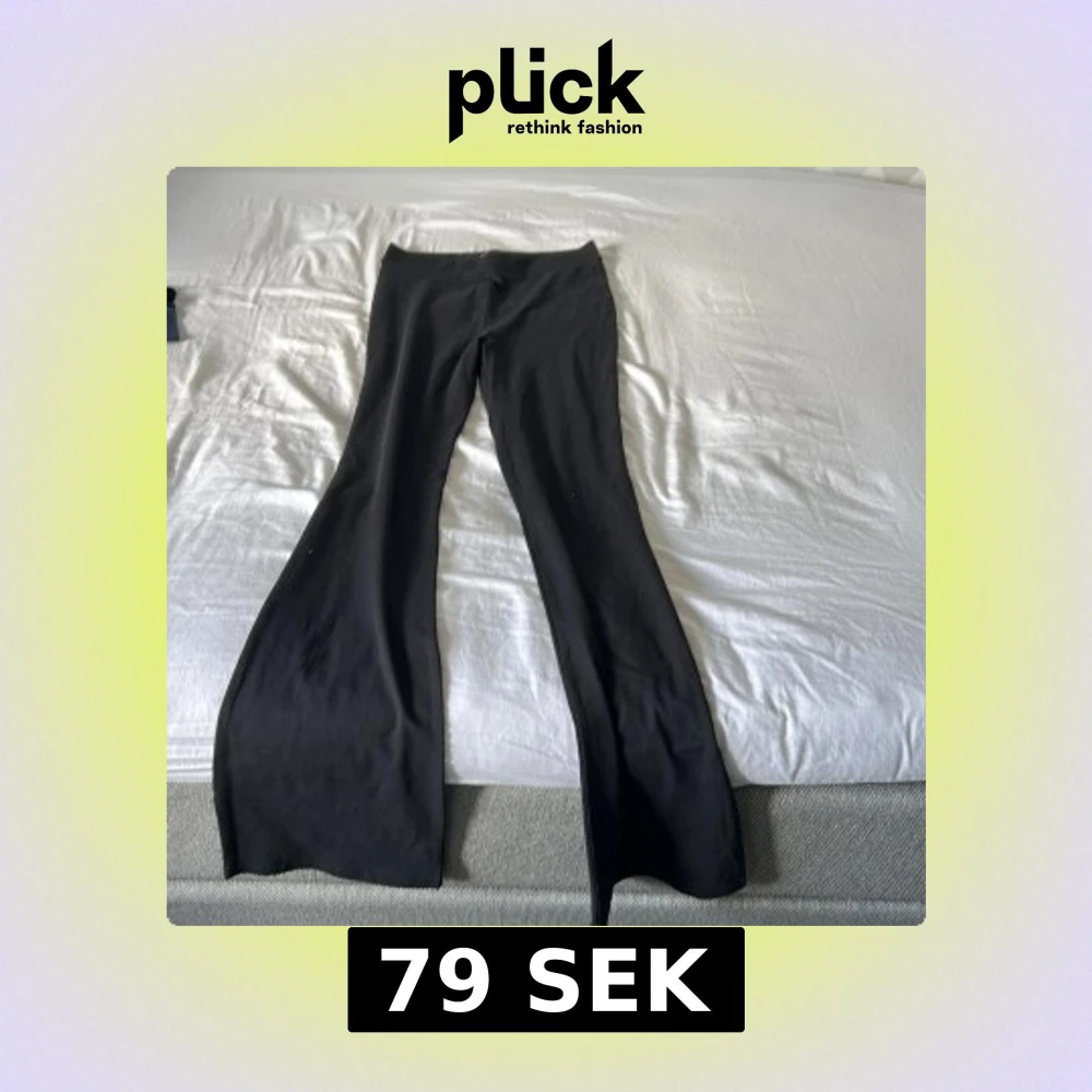 Säljer ett par svarta bootcut byxor med riktigt utsvängda ben. De har en clean look utan synliga fickor eller detaljer och är perfekta om du gillar en stilren vibe. Sitter snyggt i midjan och är gjorda i ett mjukt material som känns skönt hela dagen.