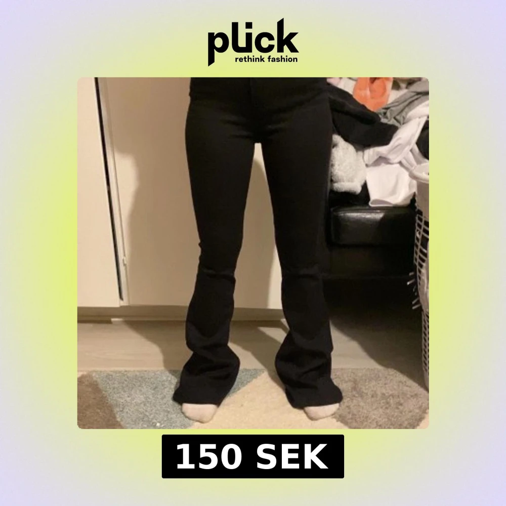 Snygga svarta byxor med bootcut passform och hög midja. Byxorna har en tight passning upptill och blir vidare nedtill vid benen. Perfekta för en trendig och stilren look.
