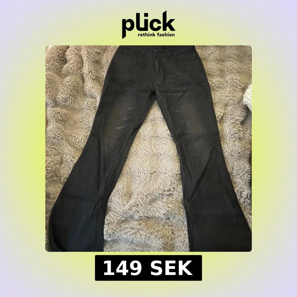Snygga svarta jeans med bootcut passform och klassiska fem fickor. Byxorna har hög midja och är tillverkade i ett mjukt jeanstyg som sitter bekvämt. Perfekta för dig som gillar en retro vibe och vill ha ett par jeans som sticker ut. Lite annorlunda material jämfört med vanligt jeans material, de gör dem lite svalare men väldigt bekväma! hör av er om ni vill ha bild eller undrar något