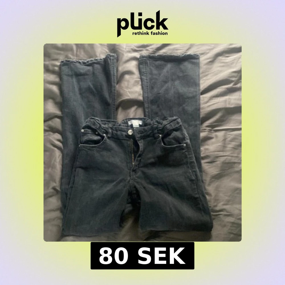 Säljer ett par svarta bootcut jeans med klassisk femficksdesign och dragkedja. Jeansen har en något utsvängd passform nertill och är tillverkade i ett mjukt denimtyg. Perfekta för dig som gillar en retrostil. Storleken är 164 men passar S och är lite för långa för mig som är 160💞 jag har spänt dom det är därför dom är lite skrynkliga där uppe
