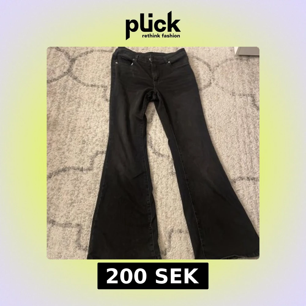 Säljer ett par svarta jeans med bootcut passform och klassisk femficksdesign. Byxorna har en snygg utsvängd siluett från knäet och är tillverkade i mjukt jeanstyg. Perfekta för dig som gillar retrovibbar och vill sticka ut med en cool look.