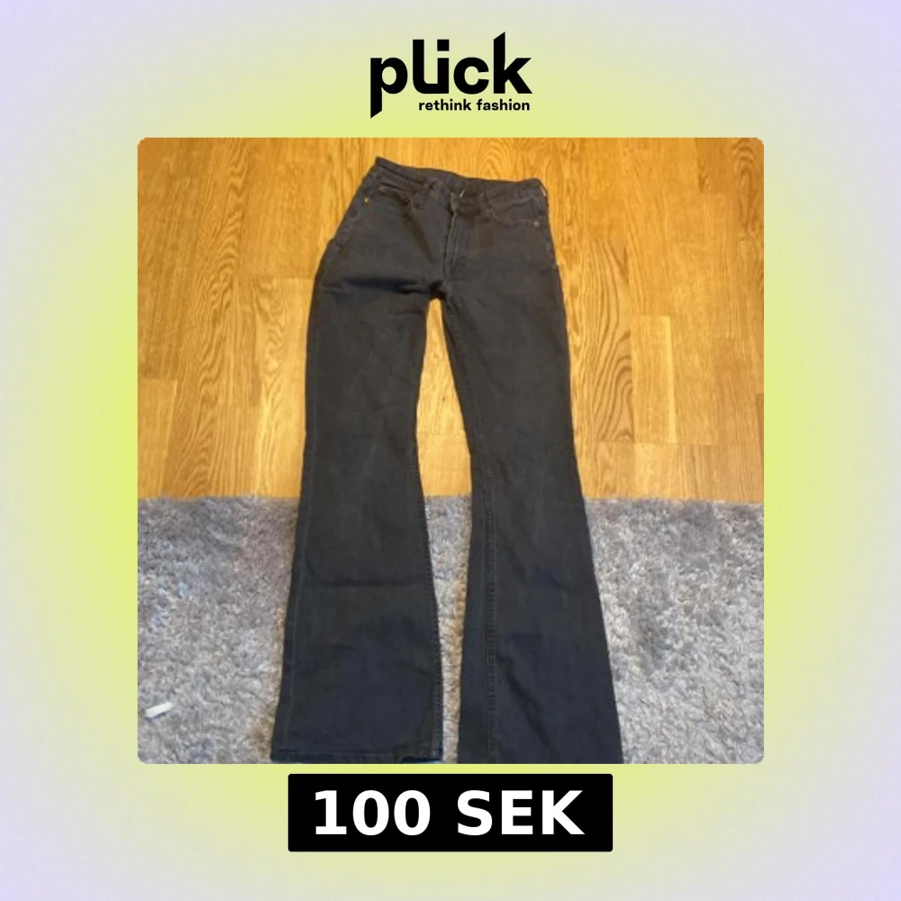 Säljer ett par svarta jeans med bootcut passform. Klassisk femficksmodell med hög midja och utsvängda ben. Perfekta till sneakers eller boots.