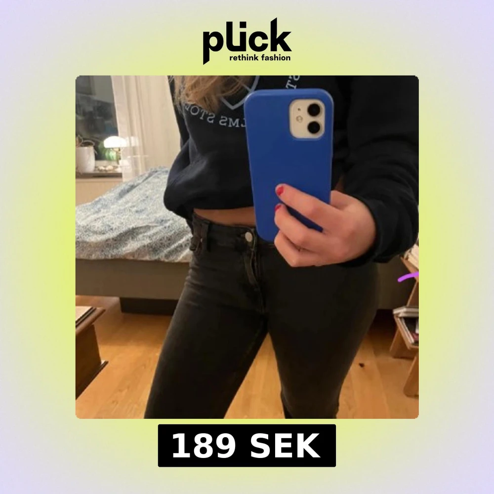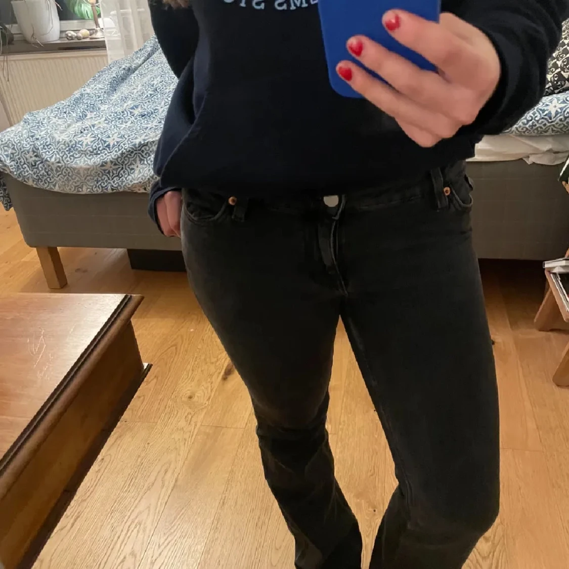 Säljer ett par svarta jeans med klassisk femficksdesign. Jeansen har en bootcut-passform och är tillverkade i robust denim. Snygga till vardags men även till fest.