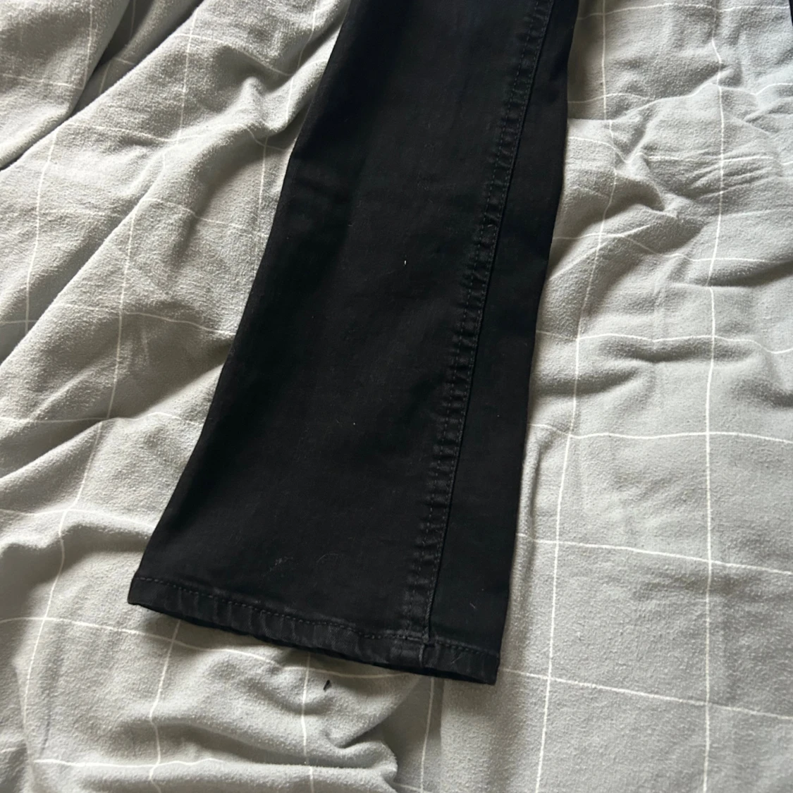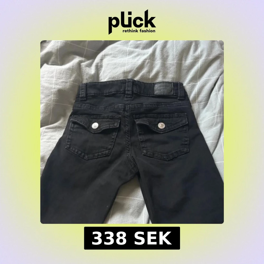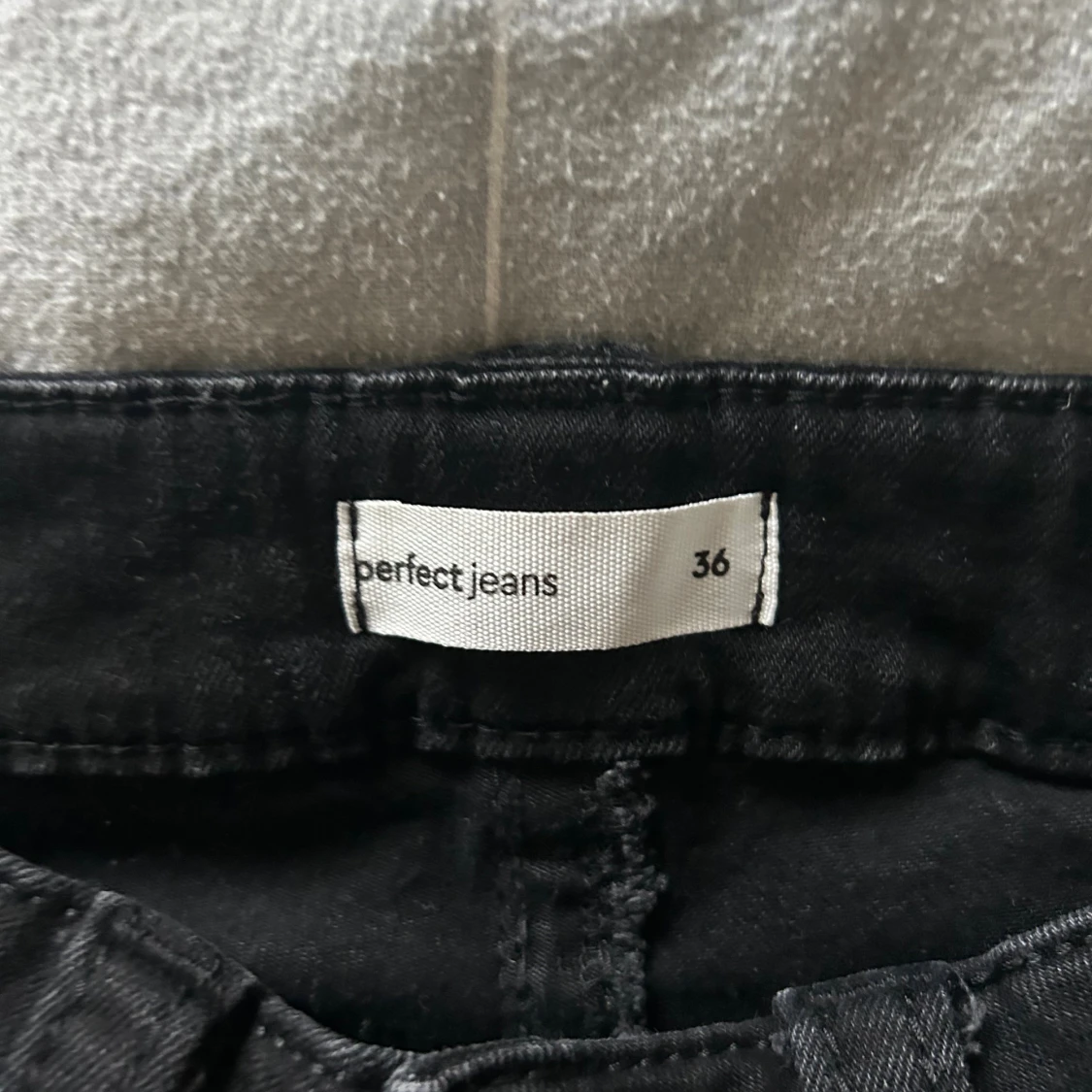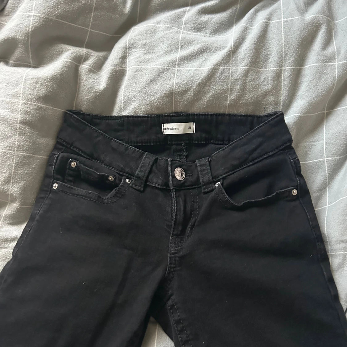 Svarta jeans från Perfect Jeans i storlek 36. Modellen har bootcut-ben, klassiska fem fickor och snygga bakfickor med lock och silverknappar. Jeansen är i stretchigt bomullsmaterial och har normal passform med lowwaist