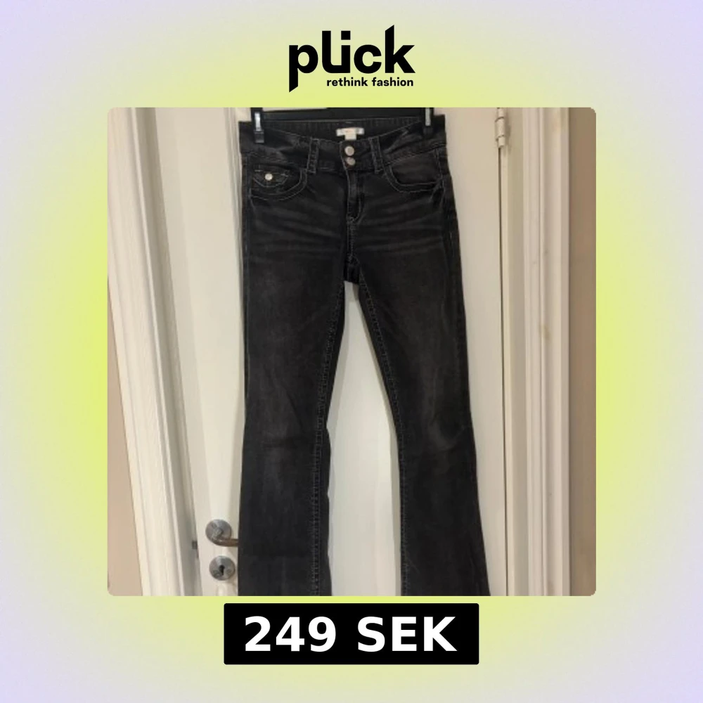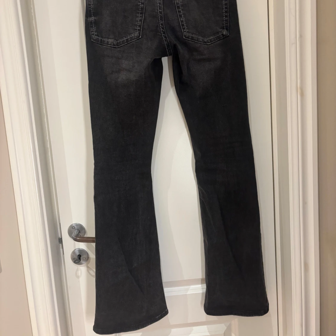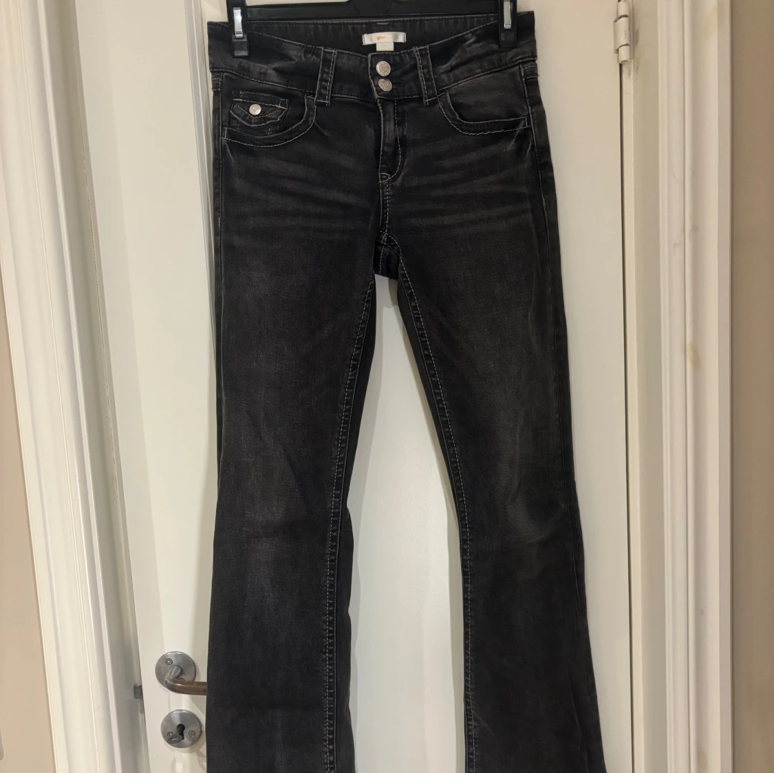 Snygga svarta bootcut jeans från Gina Young med dubbla knappar i midjan. Perfekta för en stilren look med en klassisk passform. Jeansen har en mörk tvätt och vita sömmar som ger en cool kontrast. Storlek 164, finns inga tydliga teckna på användning. Använda max 10 gånger 🩷🩷BOOTCUT LÅGMIDJADE