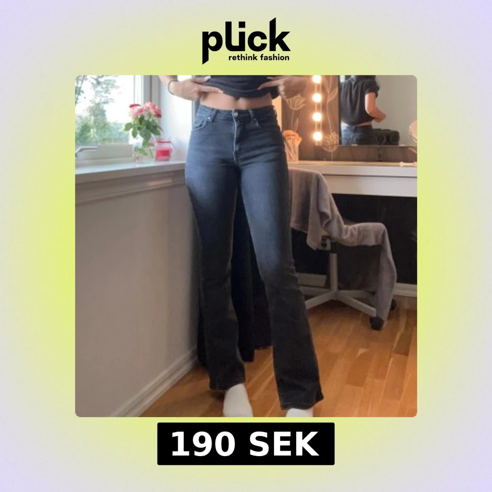 Säljer ett par svarta bootcut jeans från Gina Tricot i storlek 34. Jeansen är högmidjade med klassisk femficksdesign och har en snygg mörk tvätt. Materialet är stretchigt denim som sitter bekvämt och framhäver figuren. Jeansen har fått ett litet hål pågrund av tvätt bak på märkeslappen men man tänker ej på det.