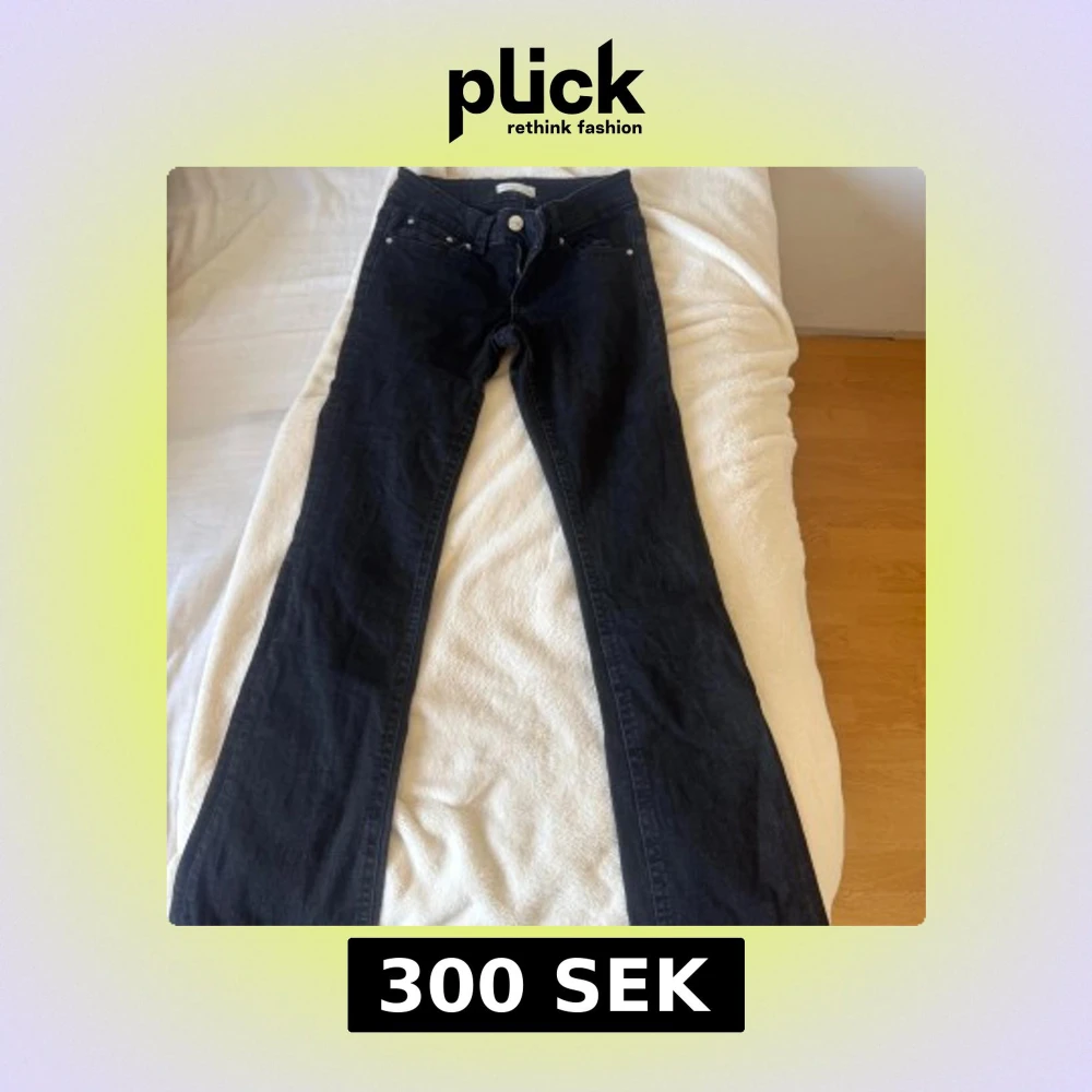 Snygga svarta jeans från Gina Tricot, modell Perfect Jeans. Bootcut passform med klassiska fem fickor och coola bakfickor med lock och knapp. Jeansen har dragkedja och knapp framtill och är gjorda i mjukt denimtyg. Är använd 2 gånger
