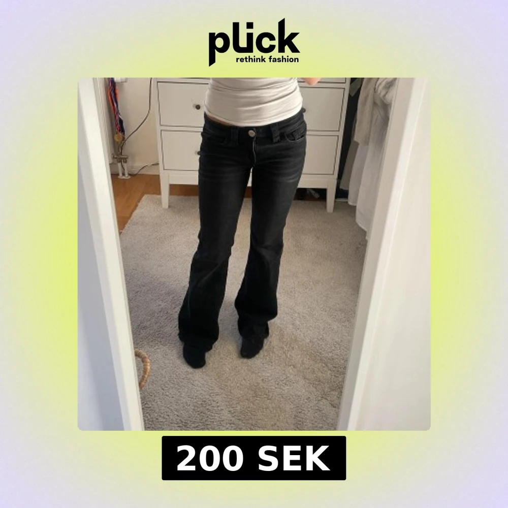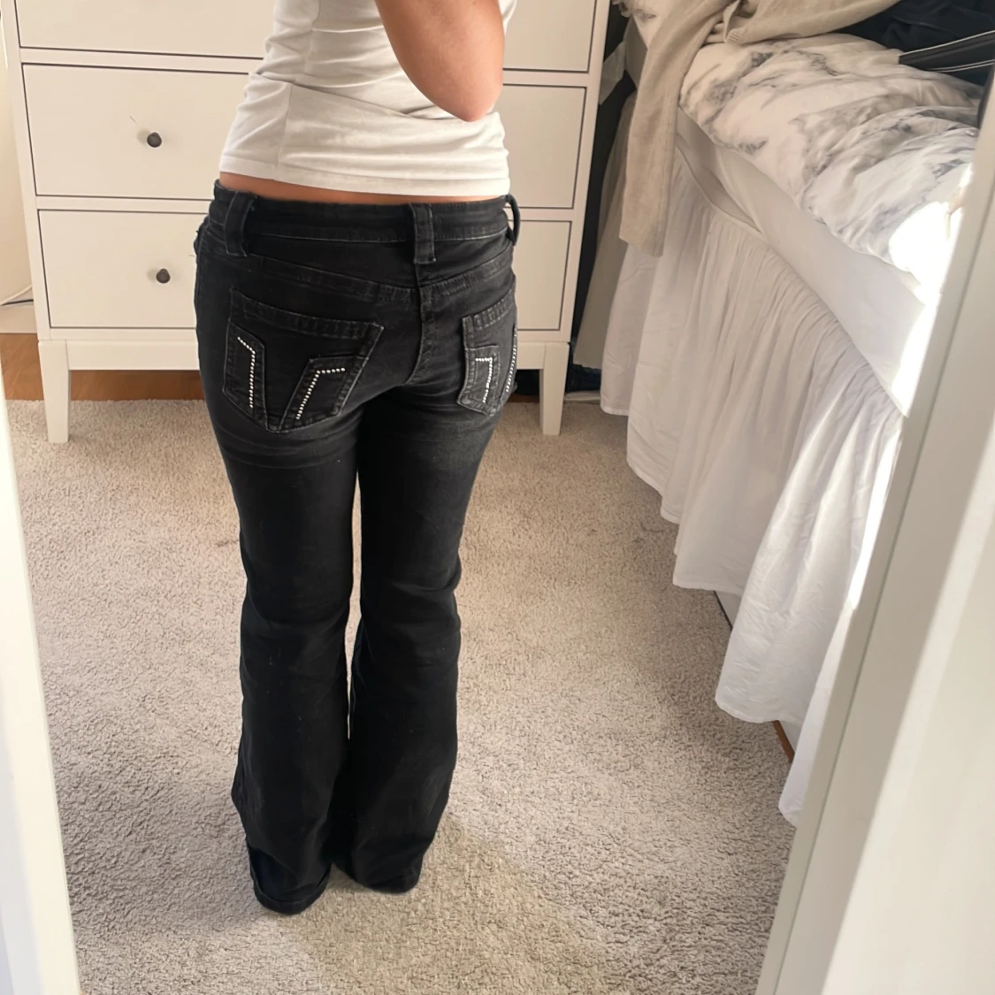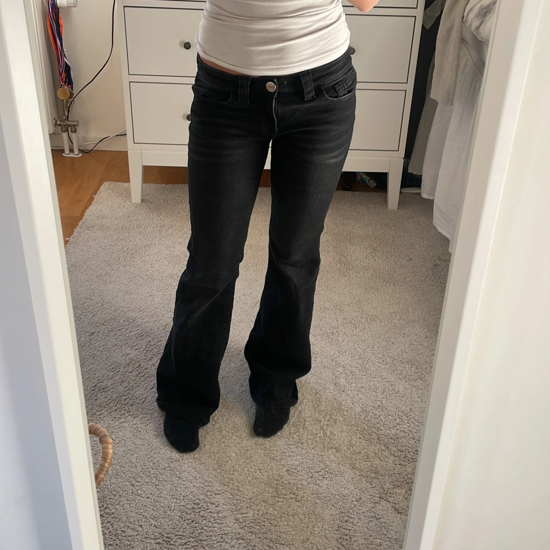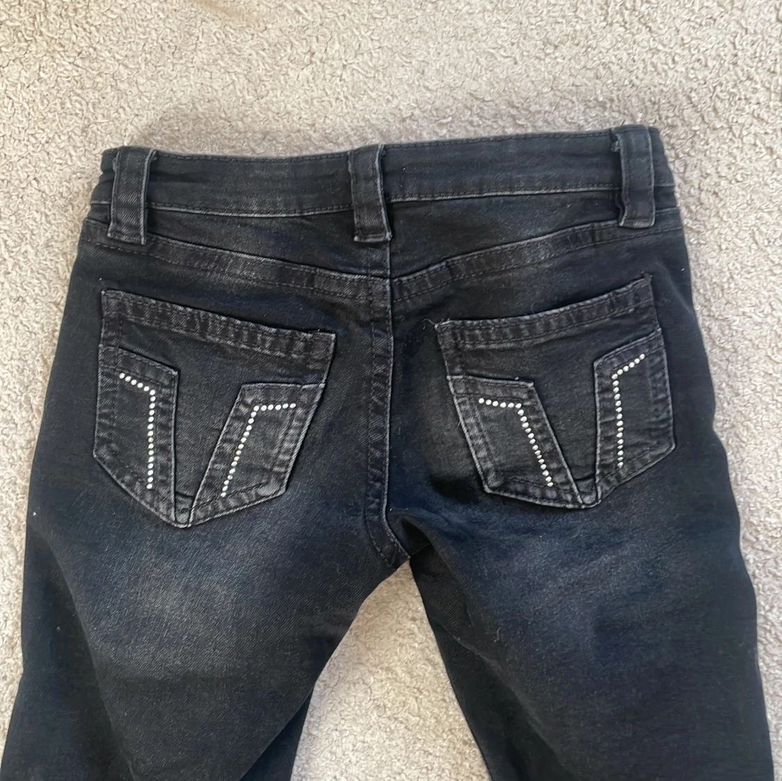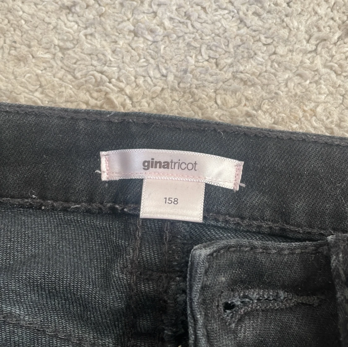 Snygga svarta jeans från Gina Tricot i storlek 158. Modellen har bootcut-ben och låg midja, med coola detaljer i form av nitar på bakfickorna. Jeansen är tillverkade i klassiskt denimtyg och har en stilren look som passar till många olika outfits.