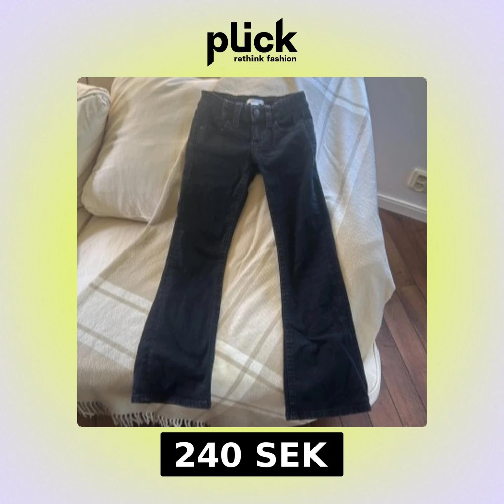 Svarta jeans från Gina Tricot i bootcut-modell med snygga detaljer på bakfickorna. Byxorna har normal passform och är tillverkade i ett mjukt bomullsmaterial. Klassisk femficksdesign och knappstängning framtill. (Med midje justering)