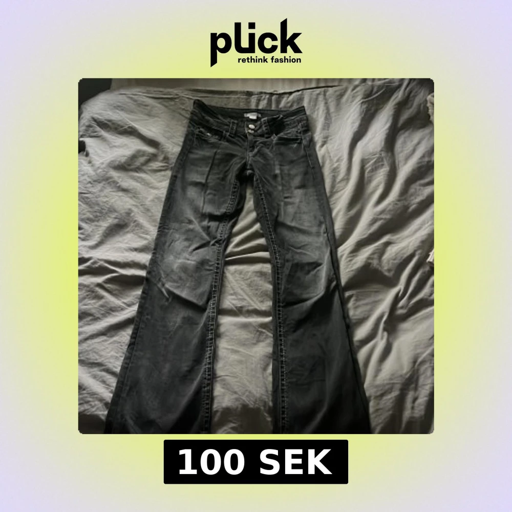 Snygga svarta bootcut jeans från Gina Tricot med dubbla knappar i midjan och klassiska fem fickor. Jeansen har en lätt tvättad look och markerade sömmar, vilket ger en cool vibe. Perfekta för dig som gillar en lite vidare passform nertill. Hittar ej bild på jeansen på hemsidan men de ser exakt så ut fast i grå/svart!