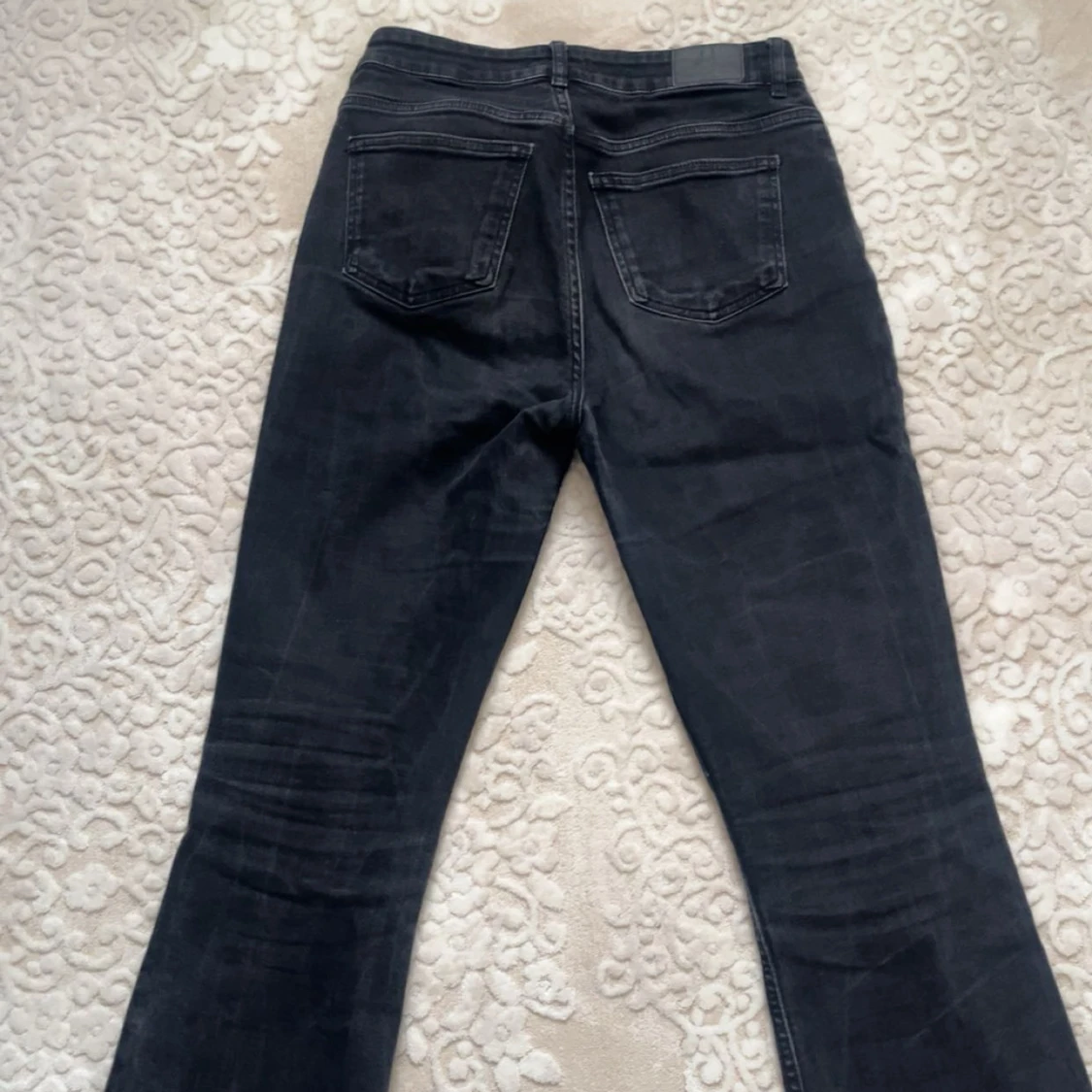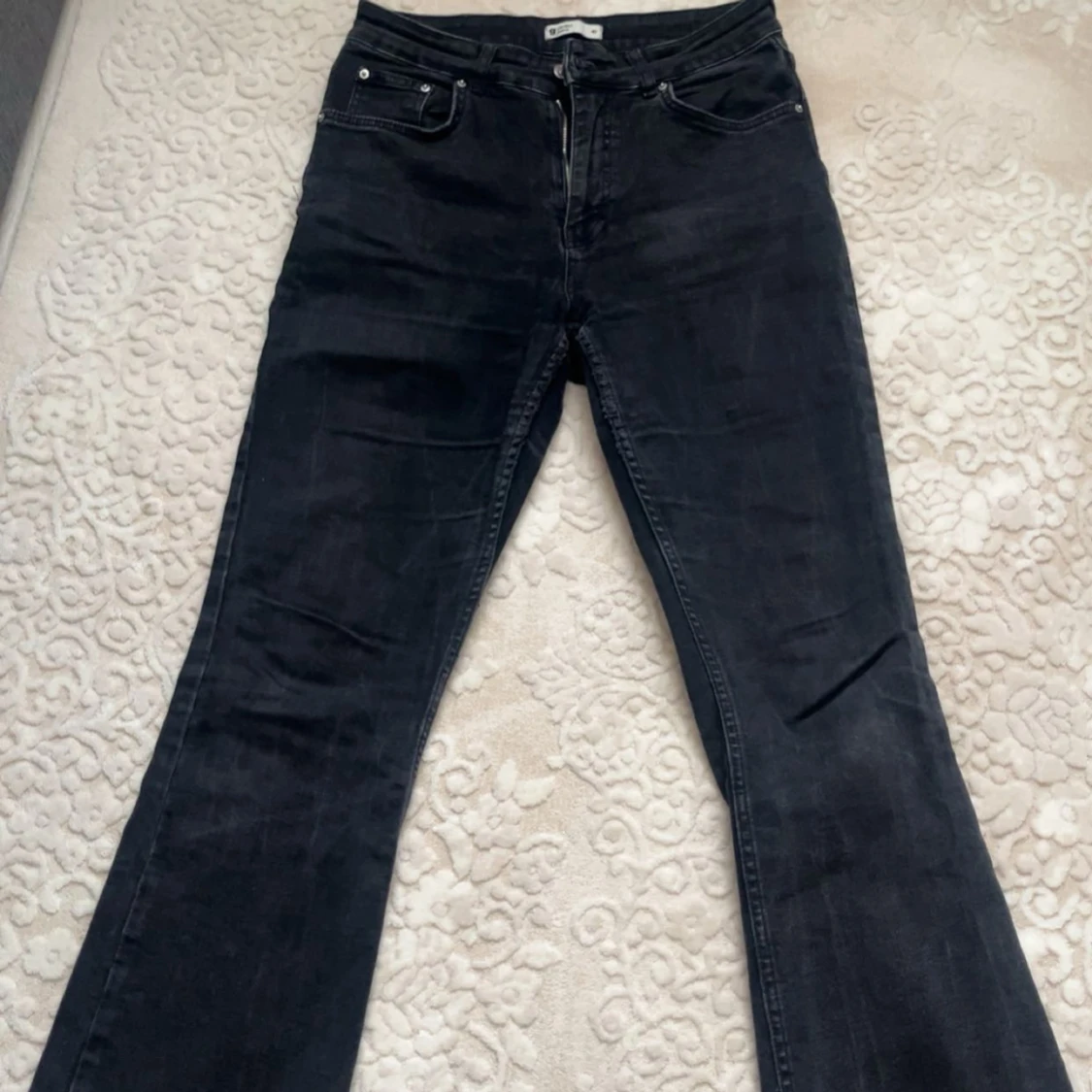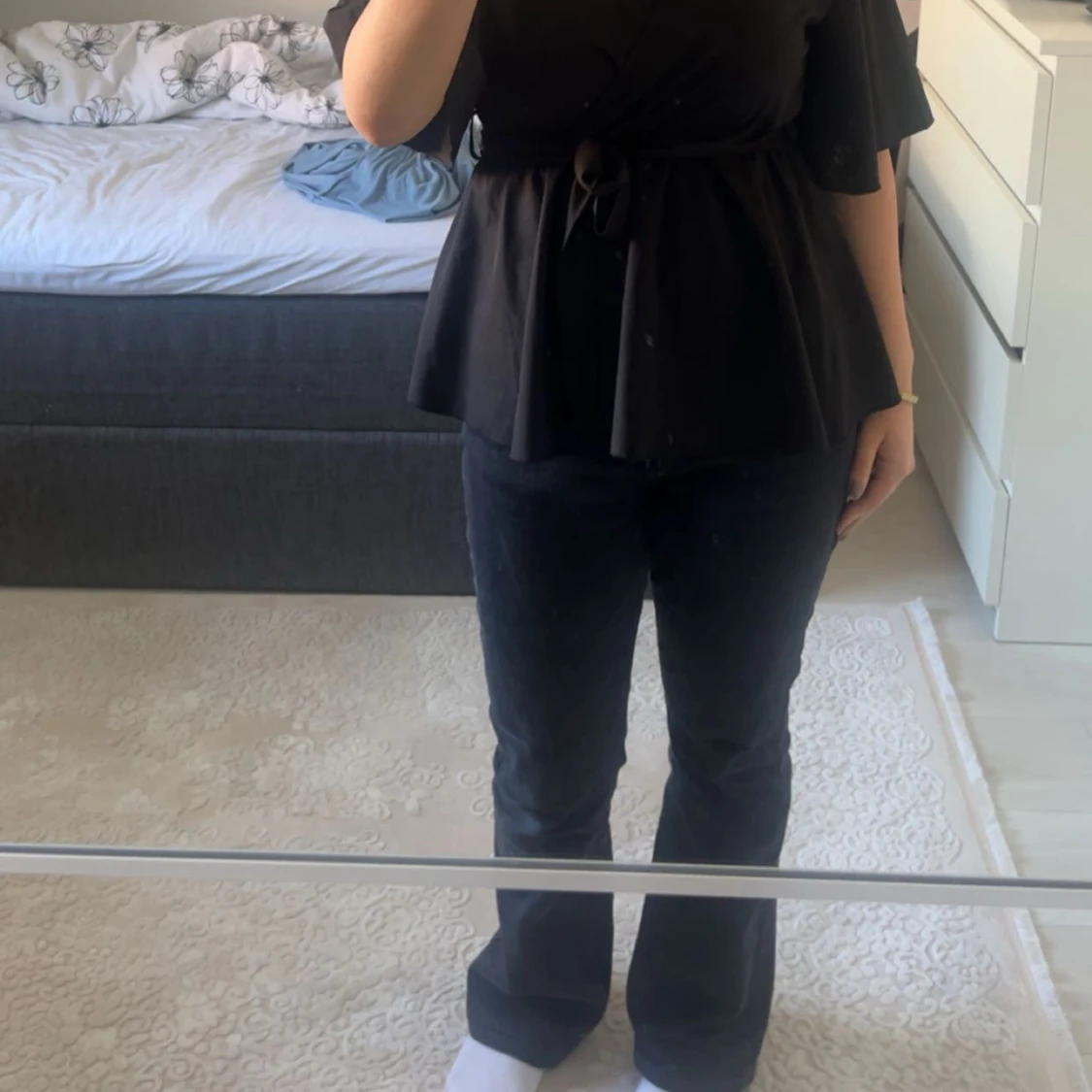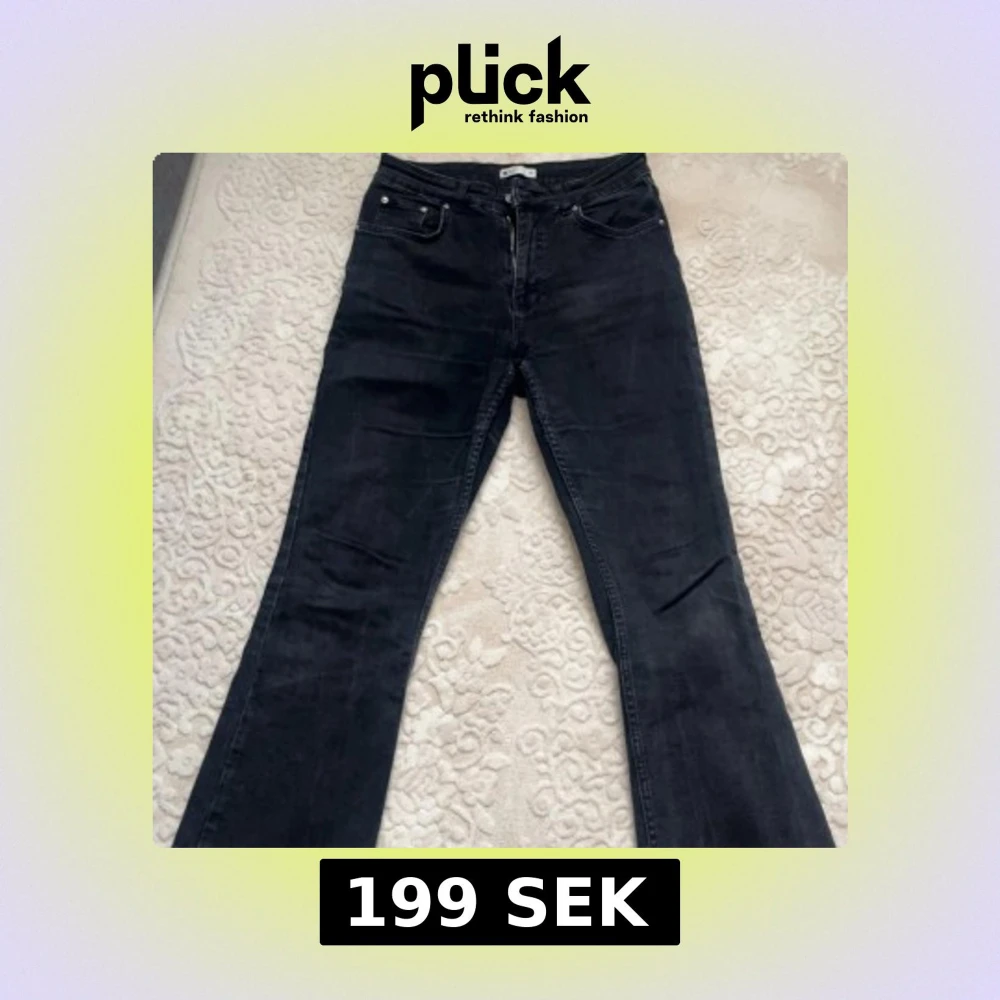Säljer ett par svarta bootcut jeans med klassisk femficksdesign. Jeansen har en snygg mörk tvätt och sitter tajt upptill med utsvängda ben. Perfekta för dig som gillar en tidlös och cool look. Jeansen är mid-waist.