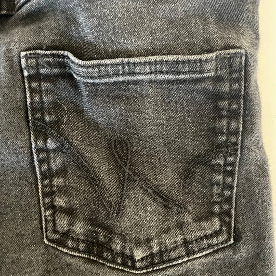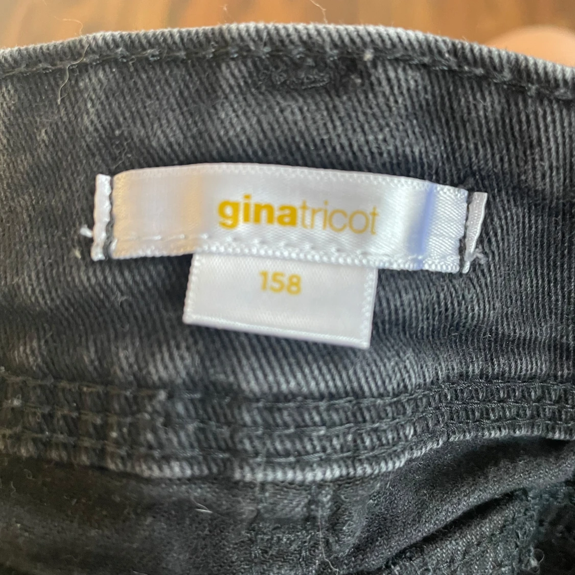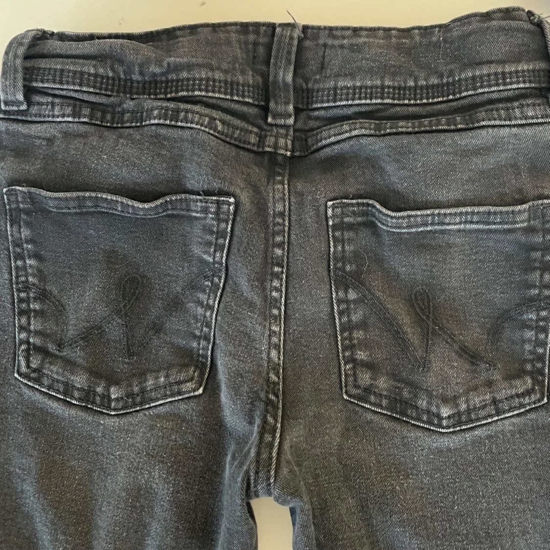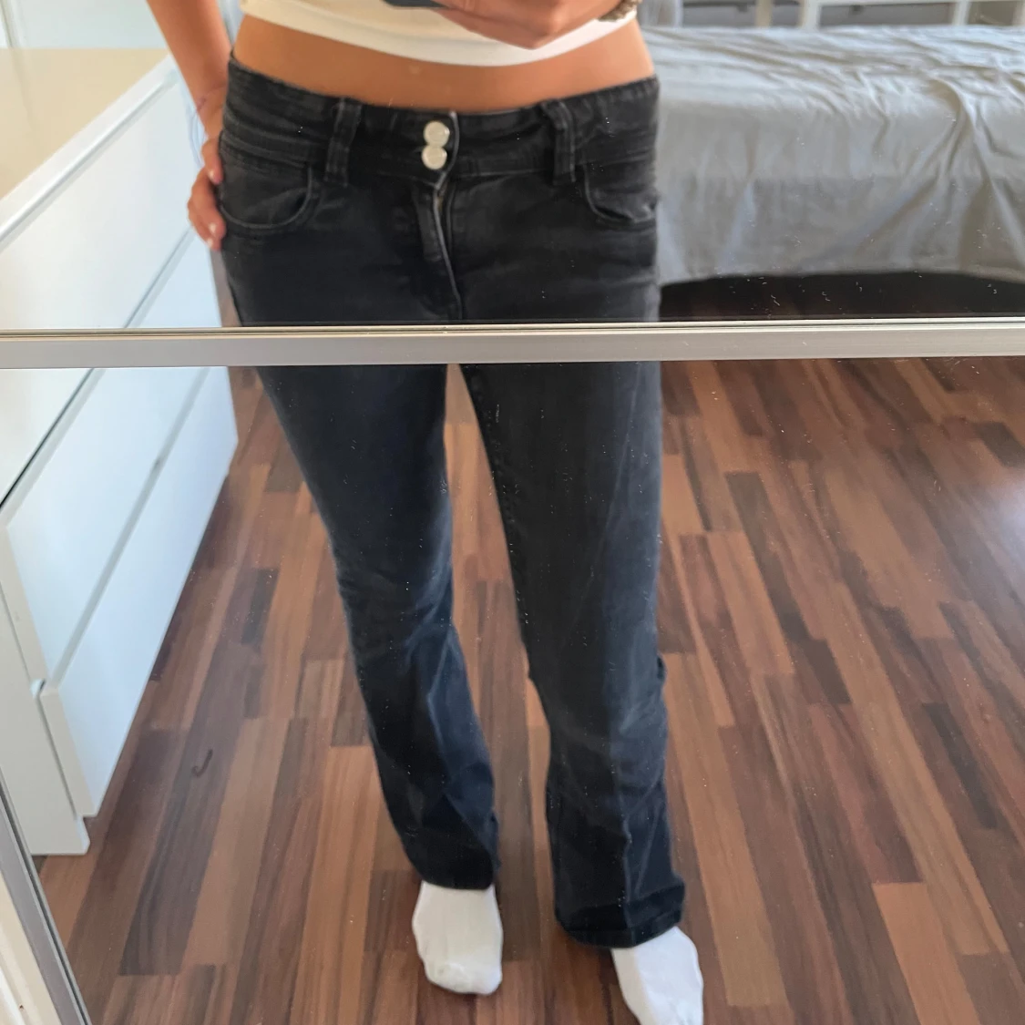 Säljer ett par svarta bootcut jeans från Gina Tricot (young) med snyggt broderade bakfickor och dubbla knappar i midjan. Jeansen har låg midja och klassisk femficksdesign. Perfekta för dig som gillar en avslappnad men ändå stilren look.