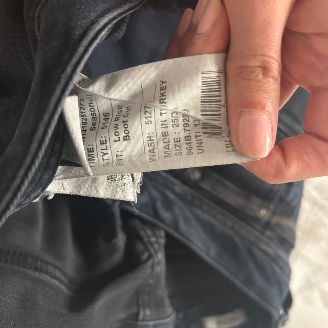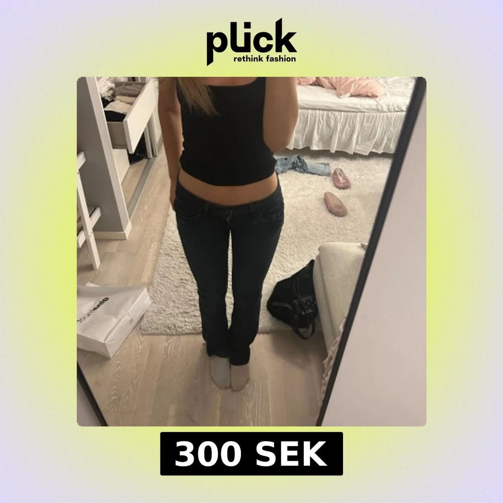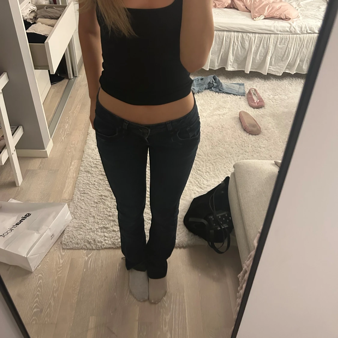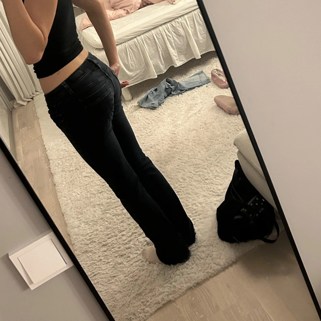 Säljer ett par svarta/marinblå jeans från Valerie i bootcut-modell. Jeansen har låg midja och snygg passform som sitter tight upptill. Jag är 165cm💕