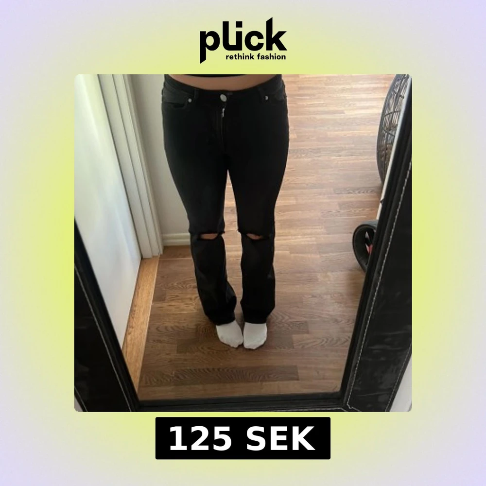 Svarta jeans från ONLY med bootcut passform och hål vid knäna för en edgy vibe. Klassisk femficksmodell med dragkedja och knapp framtill. Jeansen är i stretchigt bomullsmaterial och har hög midja som sitter snyggt.